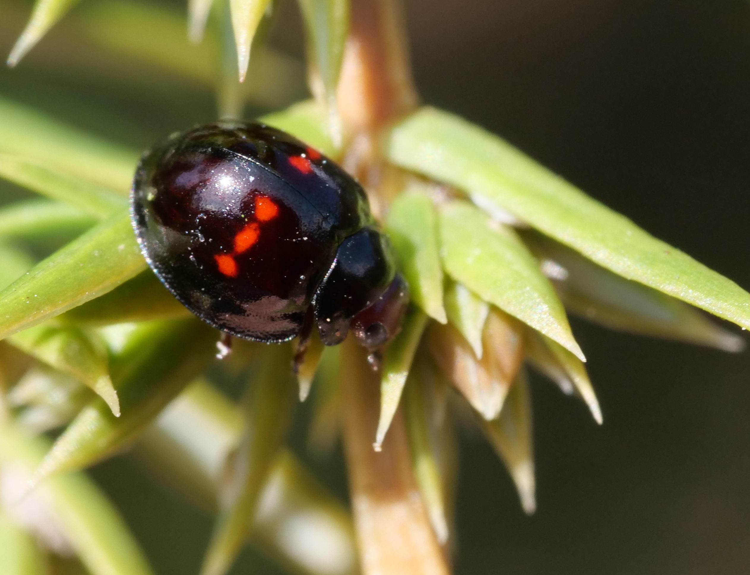 In Heiden und Buschland auf Nadel- und Laubbäumen sowie Heidelbeeren; überwintert in der Streu oder in Rindenritzen (Roy & Brown 2018; Nedvěd 2020).