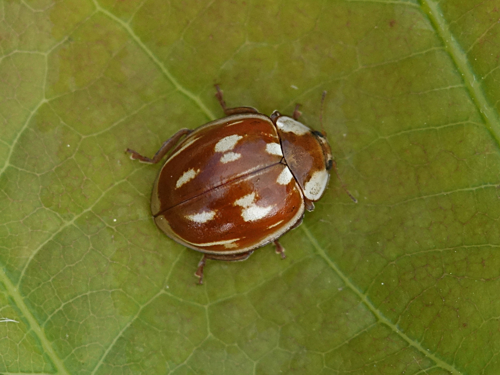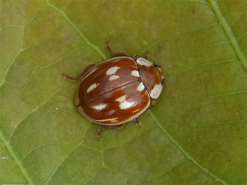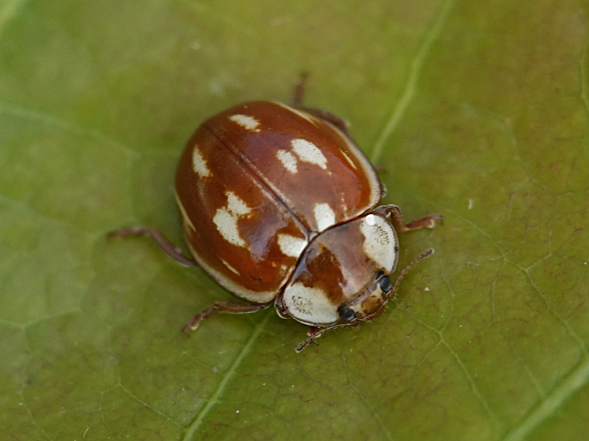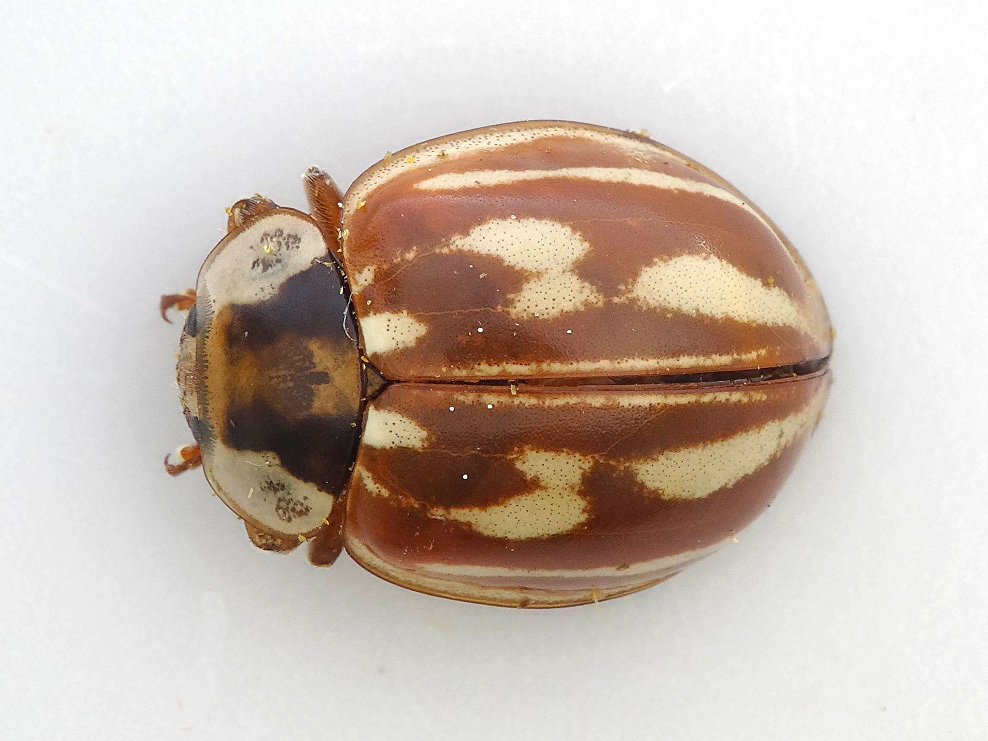 Thorax: Halsschild (Pronotum) braun, in der Mitte am Hinterrand ein blasses "M", die Seiten je mit einem großen weißen Fleck. Flügeldecken (Elytren) braun bis rotbraun, mit 0–15 weißen Streifen oder Punkten; Außenrand der Flügeldecken deutlich, Innenrand fein oder undeutlich weiß gerandet.