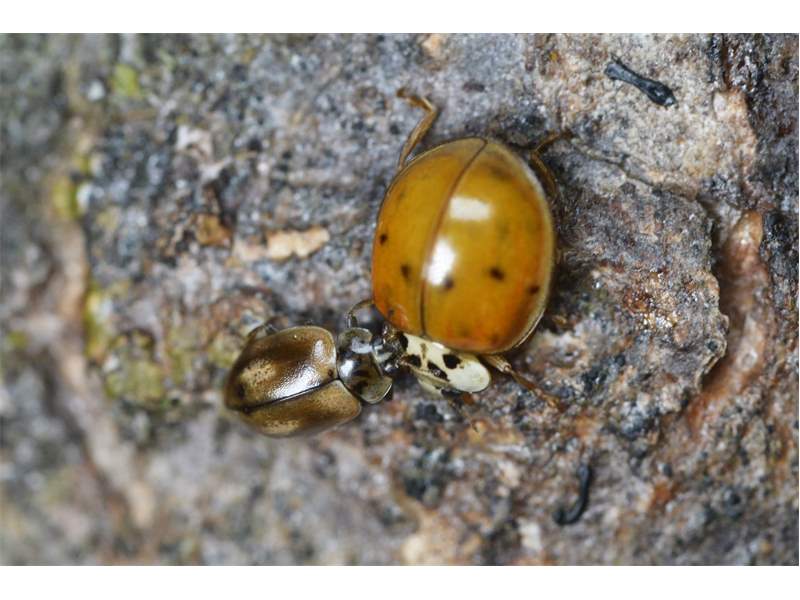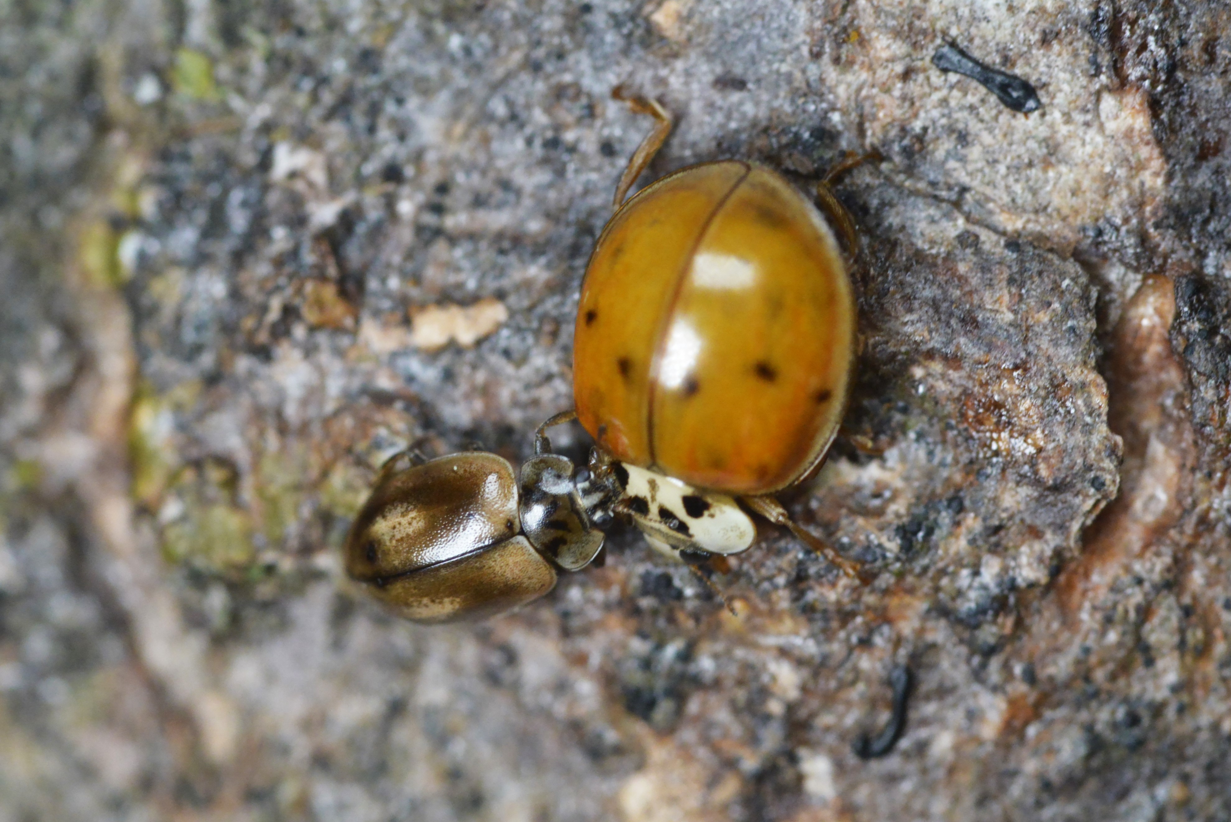 Nadelbaum-Marienkäfer (links) neben einem Asiatischen Marienkäfer (rechts). Pöhla, Luchsbachtal, 5. Oktober 2022