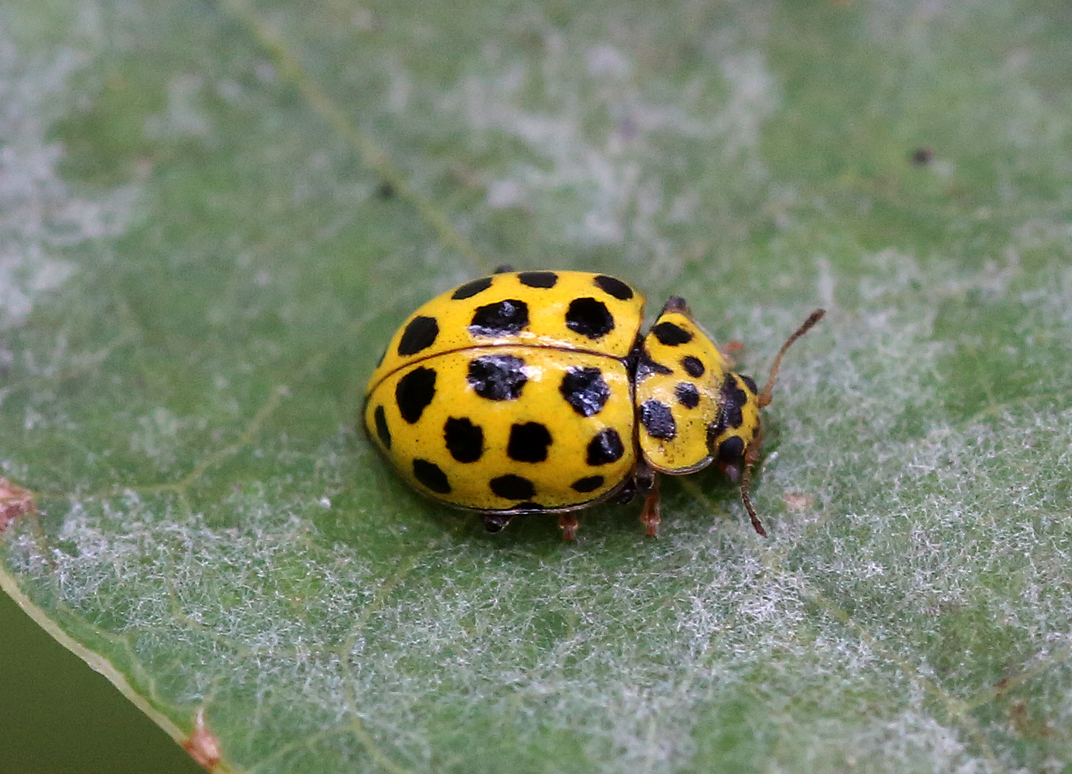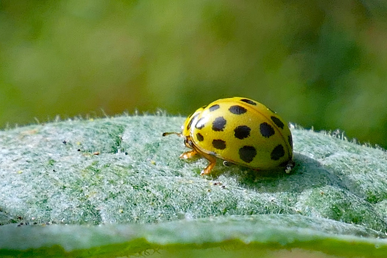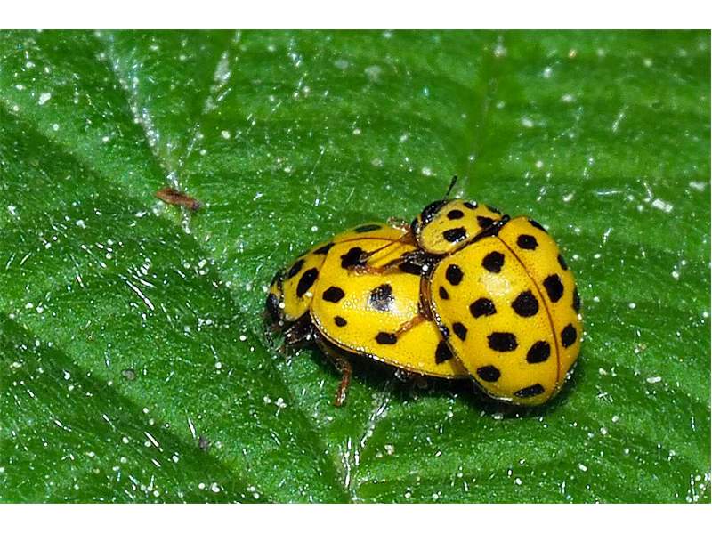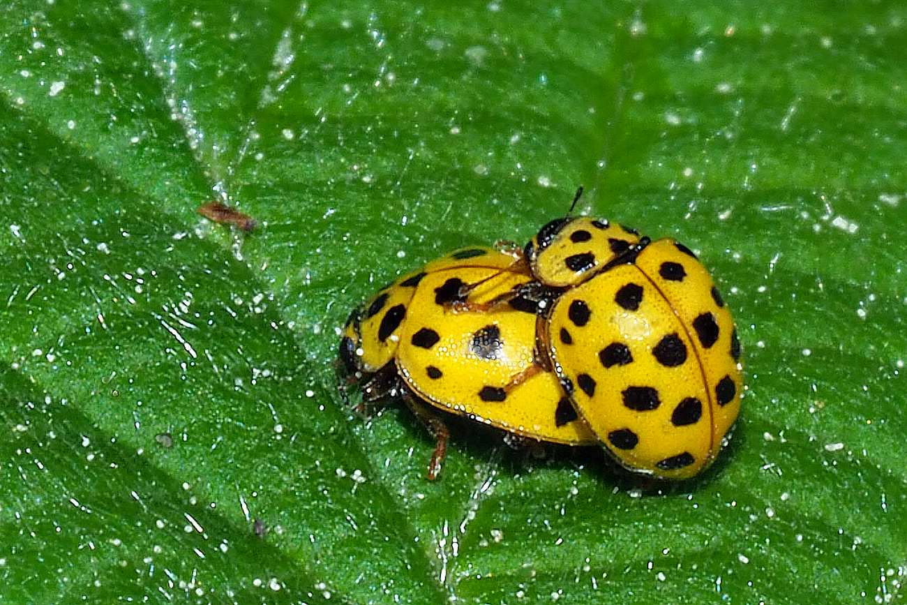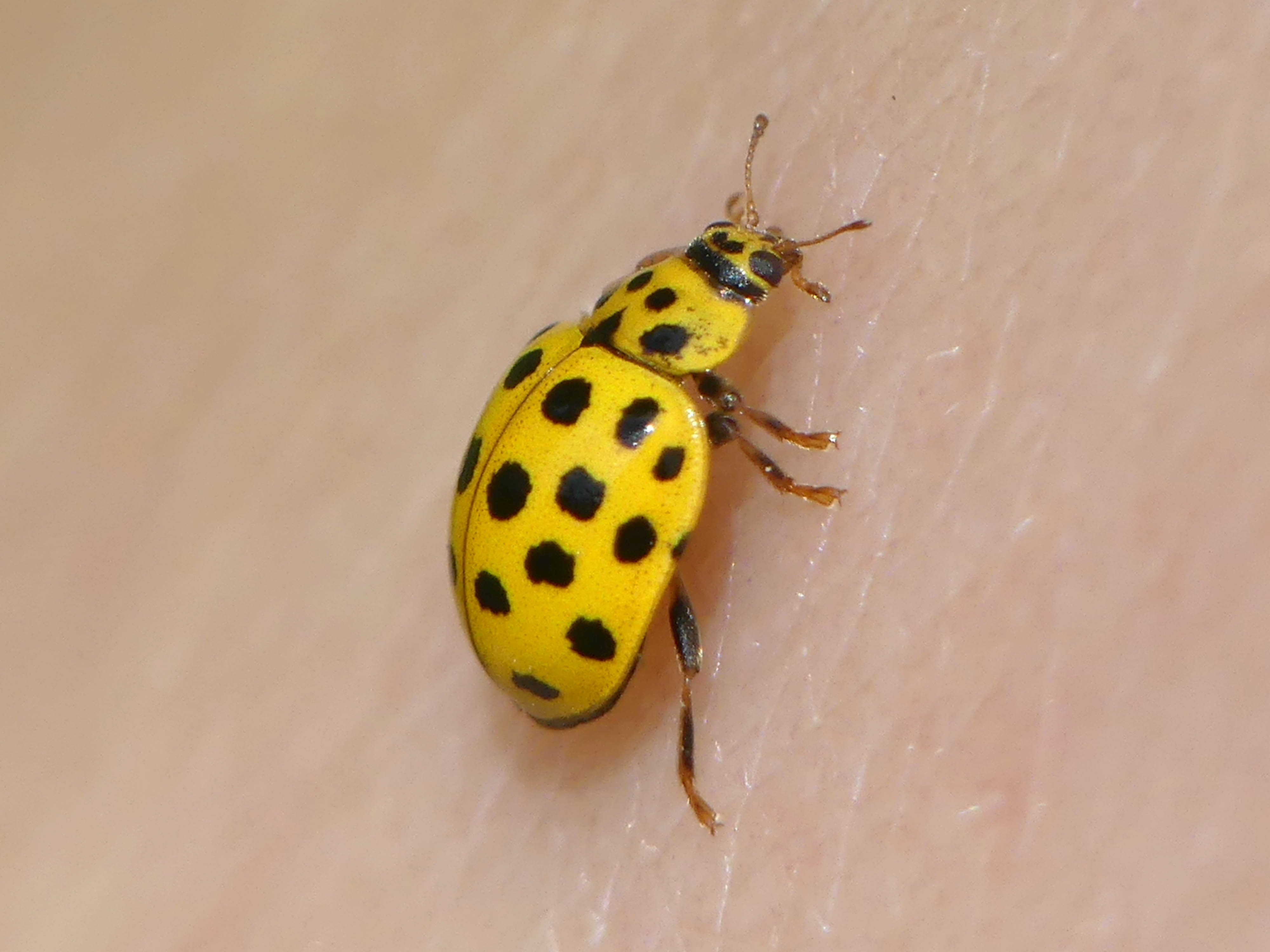 Ähnliche Arten: Zwei weitere Arten mit gelber Grundfarbe aber mit einer schwarzen Flügeldeckennaht sind der Sechzehnpunkt-Marienkäfer ( Tytthaspis sedecimpunctata), der seitlich eine schwarze, horizontale Linie aufweist und der Schachbrett-Marienkäfer ( Propylea quatuordecimpunctata) mit meist rechteckigen Flecken, die oft miteinander verschmolzen sind.
