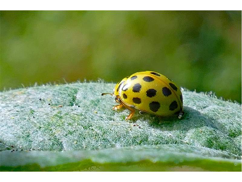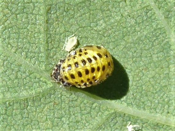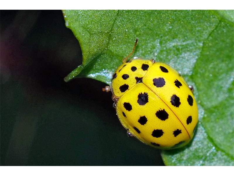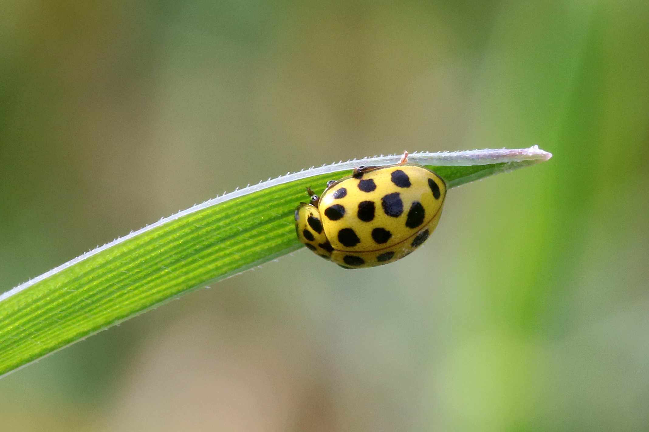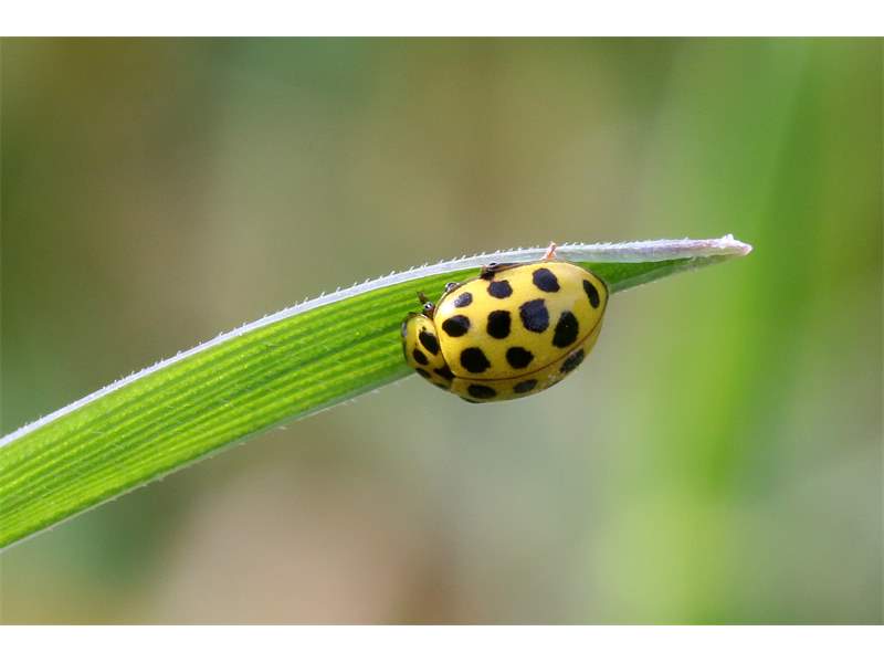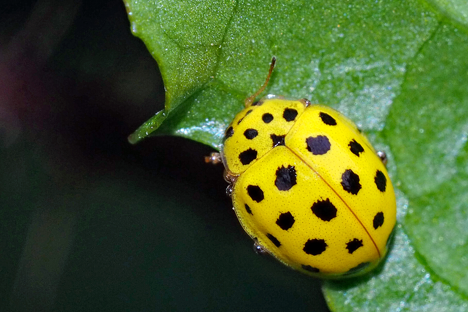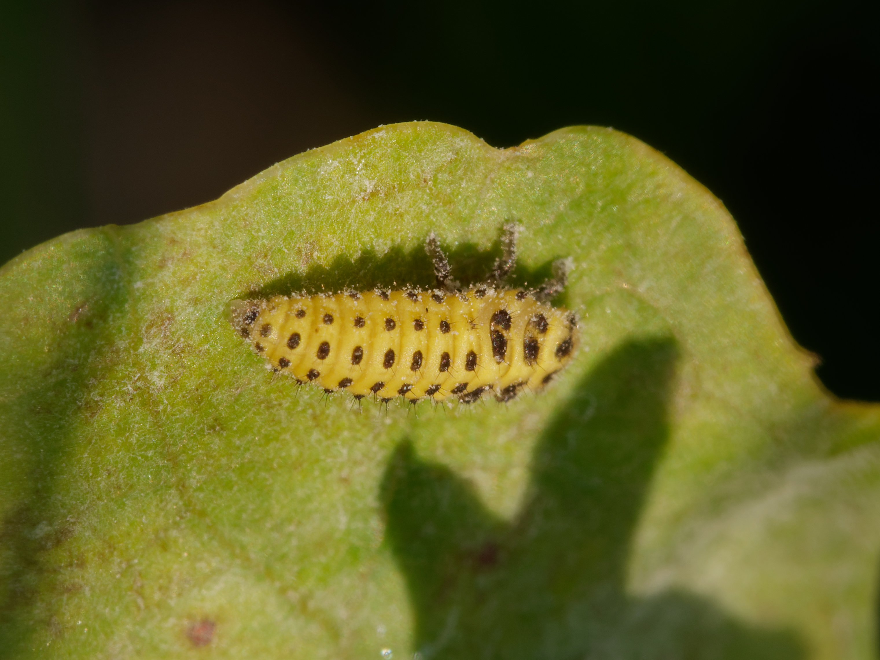 Ähnliche Arten: Zwei weitere Arten mit gelber Grundfarbe aber mit einer schwarzen Flügeldeckennaht sind der Sechzehnpunkt-Marienkäfer ( Tytthaspis sedecimpunctata), der seitlich eine schwarze, horizontale Linie aufweist und der Schachbrett-Marienkäfer ( Propylea quatuordecimpunctata) mit meist rechteckigen Flecken, die oft miteinander verschmolzen sind.