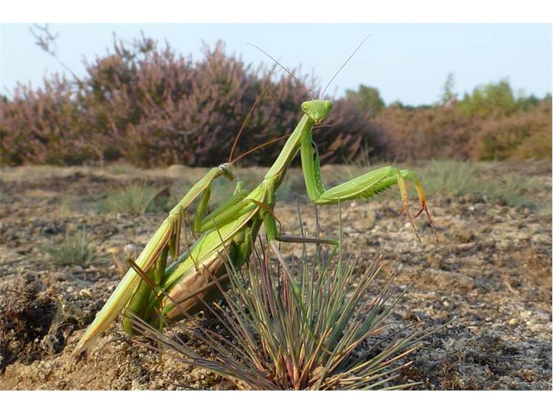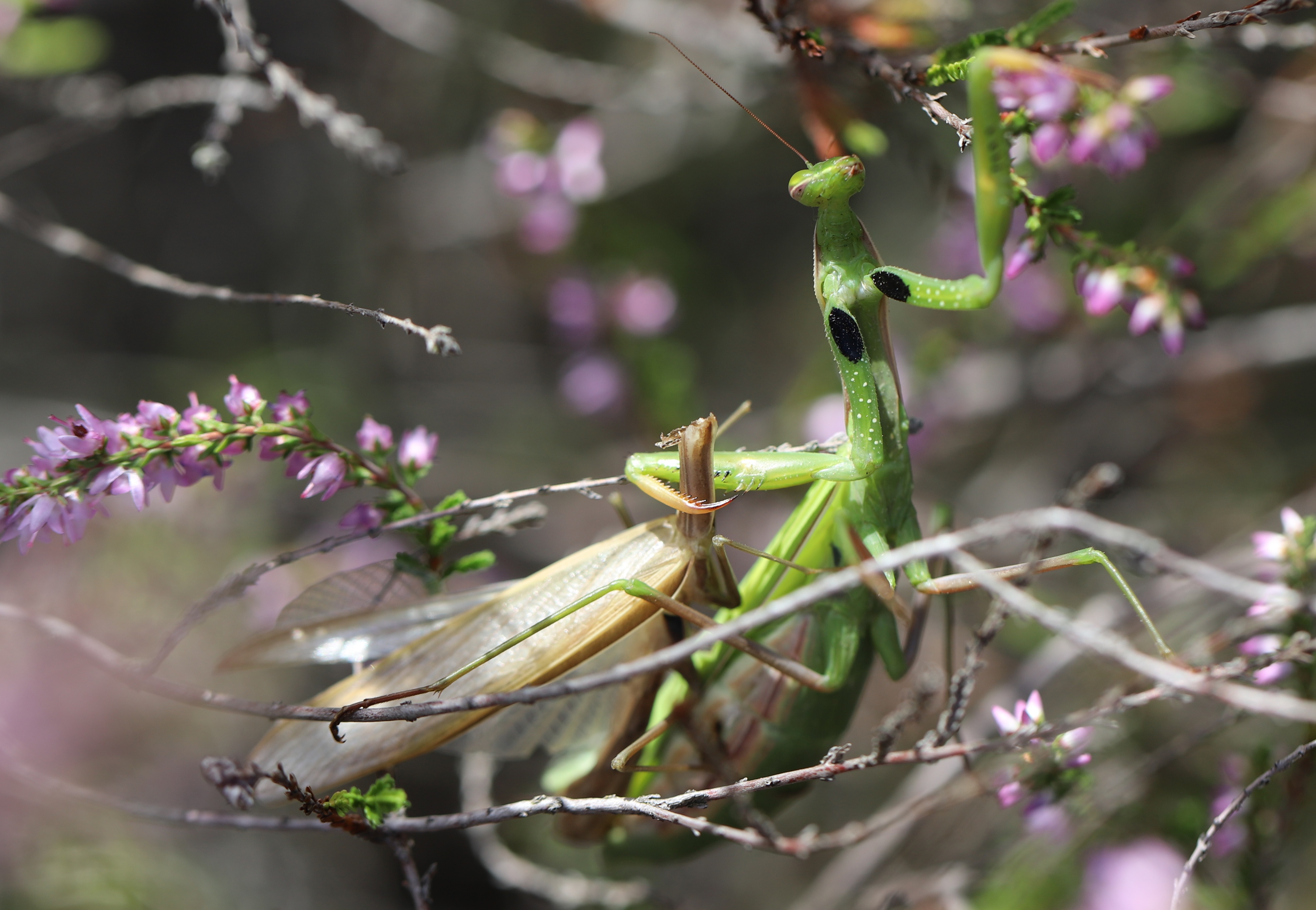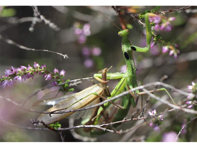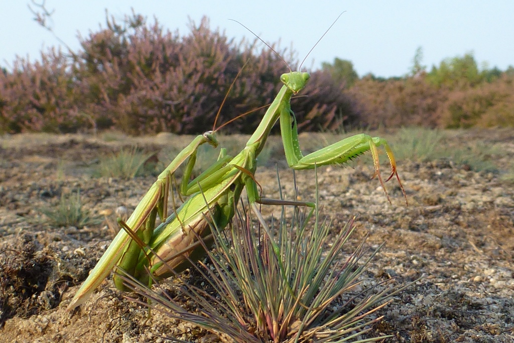 Gottesanbeterin zwischen blühendem Heidekraut in der Tagebaufolgelandschaft bei Nochten am 03.09.2010
