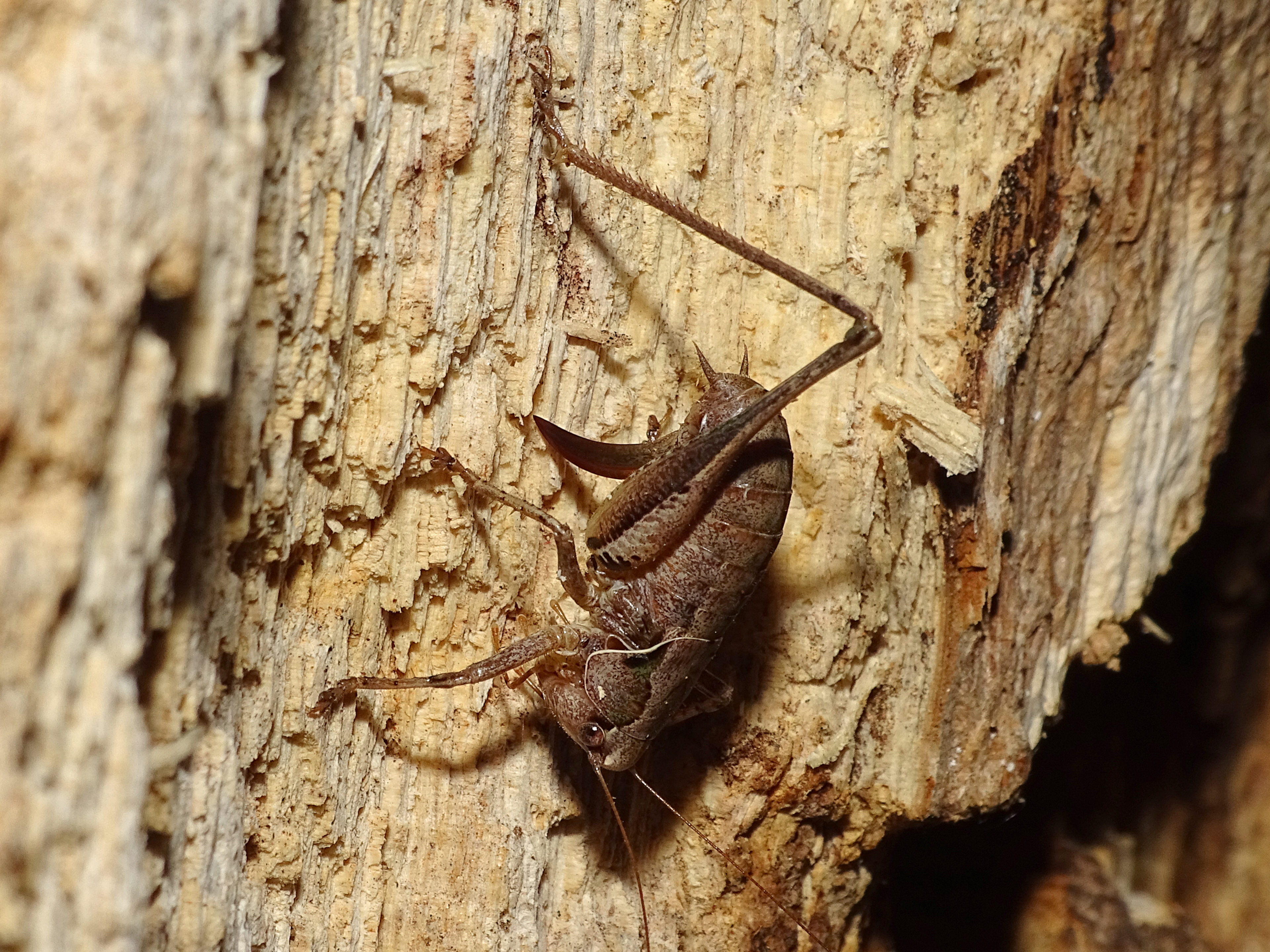 Weibchen der Gewöhnlichen Strauchschrecke bei der Eiablage. in der Gemarkung Hohenprießnitz, Juli 2018, Eiablage an alter Stieleiche ( Quercus robur) (© Michael Happ)( Bild vergrößern)