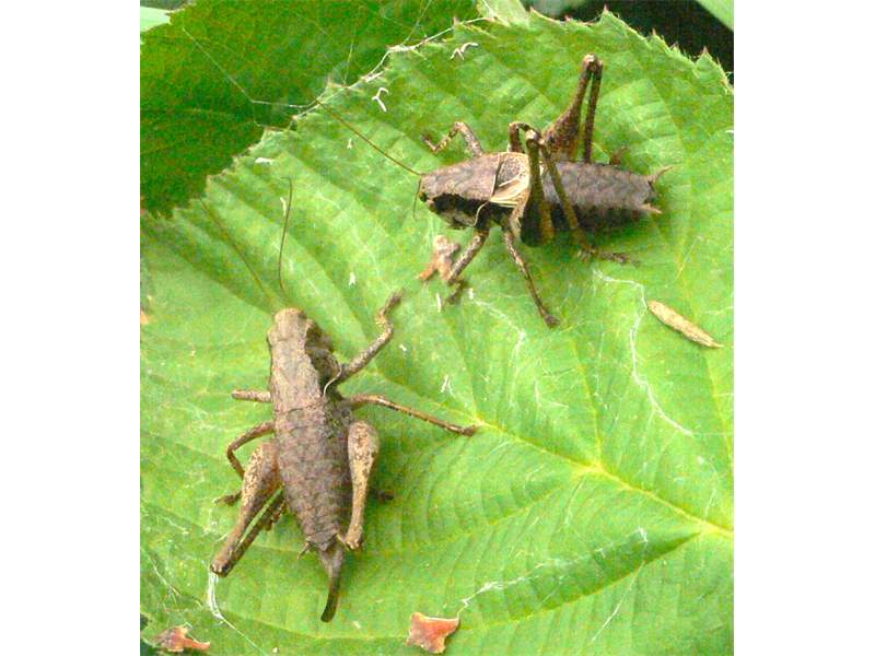 Gewöhnliche Strauchschrecke (Pholidoptera griseoaptera (De Geer, 1773)), Weibchen (Legeröhre) und Männchen, Friedewald bei Auer, August 2013. (© Udo Lemke)( Bild vergrößern)