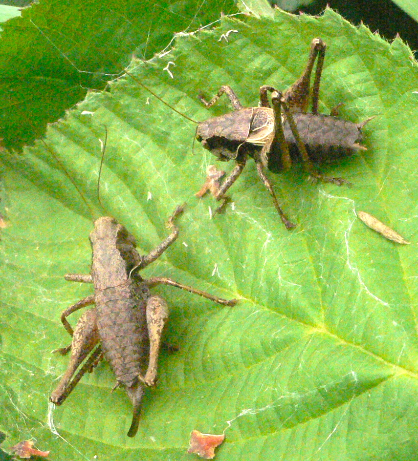 Gewöhnliche Strauchschrecke (Pholidoptera griseoaptera (De Geer, 1773)), Weibchen (Legeröhre) und Männchen, Friedewald bei Auer, August 2013.