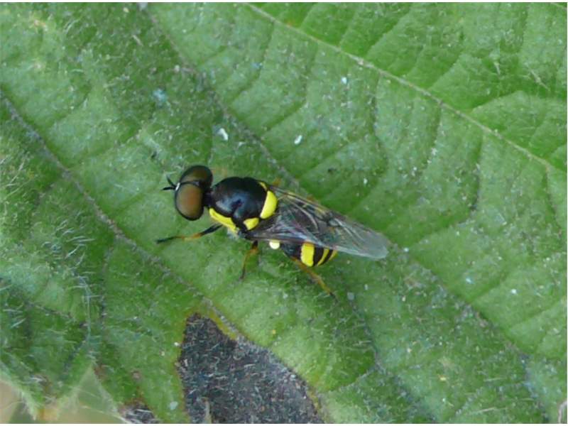 Schildchen mit zwei Dornen (für viele Waffenfliegen charakteristisch). Typisch für O. rara ist der große gelbe Fleck oberhalb der Seitennaht am Thorax.