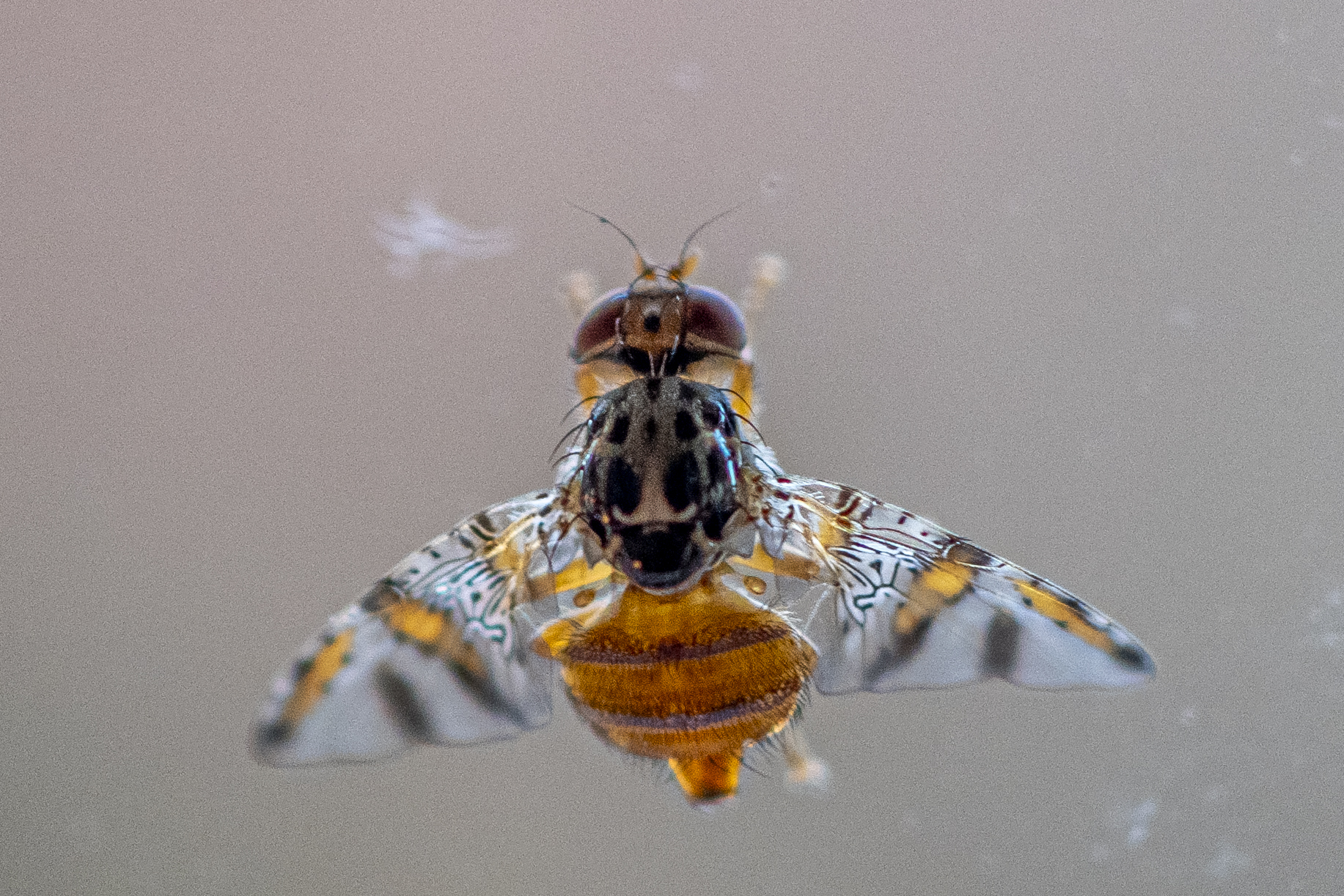 Mittelmeerfruchtfliege in Dresden-Striesen. Insgesamt wurden sechs leere Puppenhüllen in der Obstschale und fünf adulte Fliegen in der Wohnung entdeckt. Die Fliegen stammten aus einer gekauften Bio-Zitrone und wurden demnach eingeschleppt. (© Michael Kurth)( Bild vergrößern)