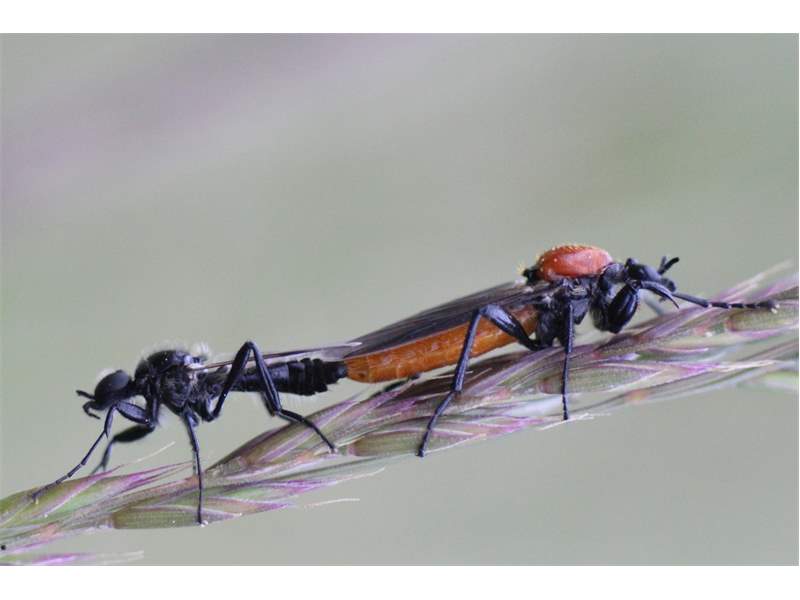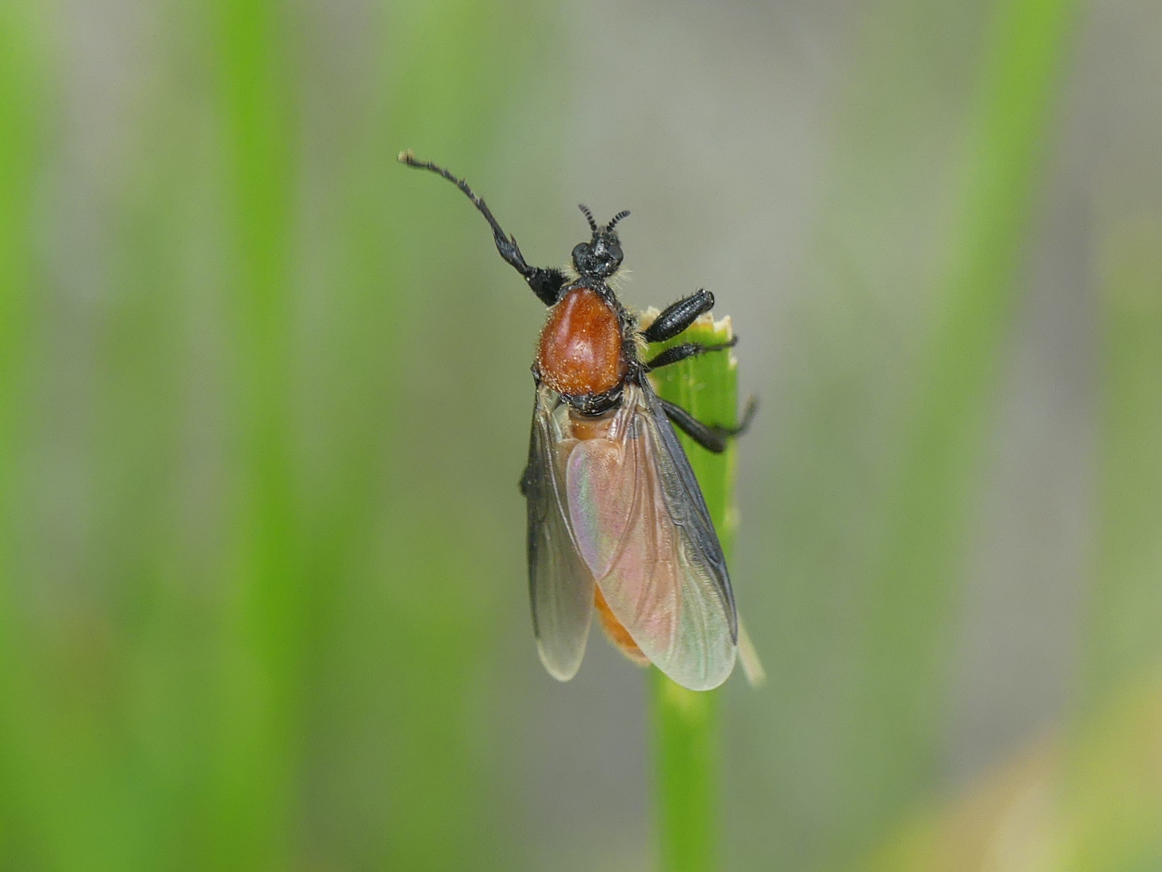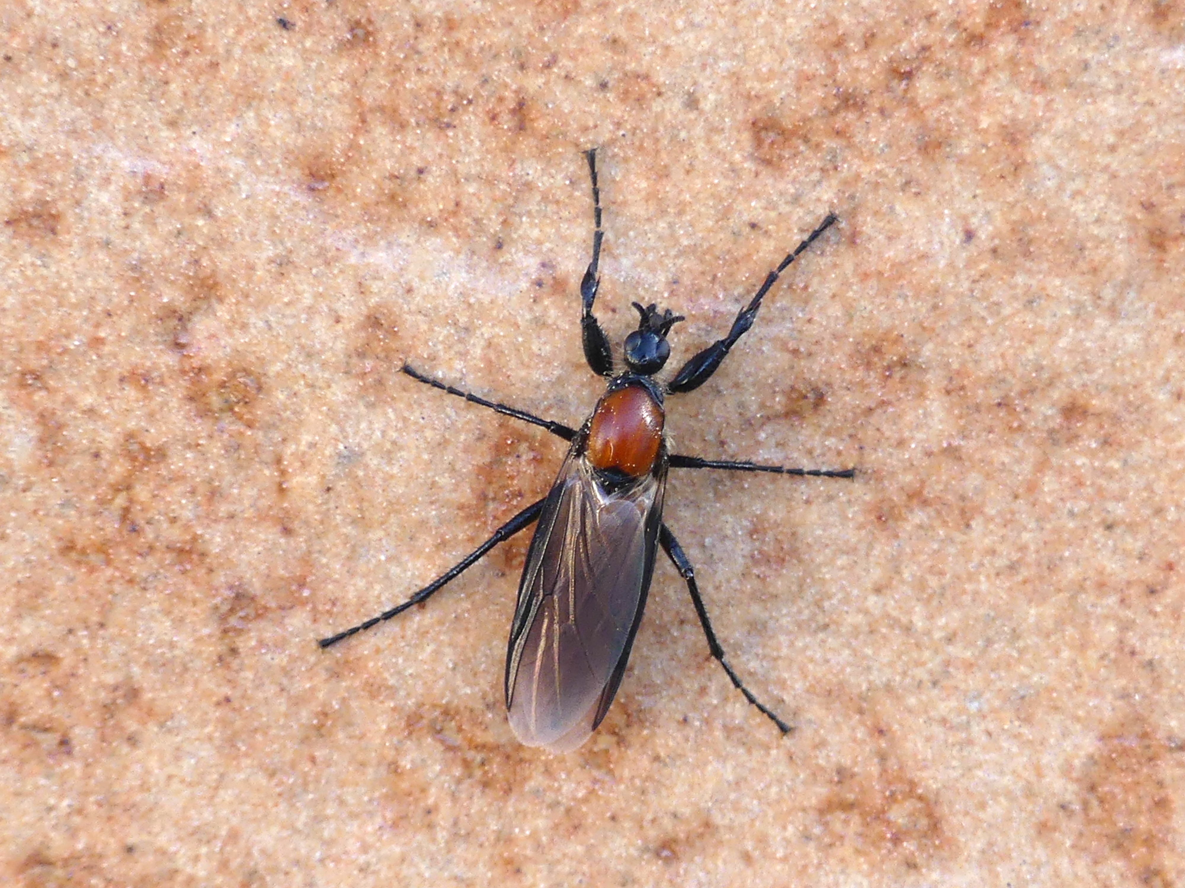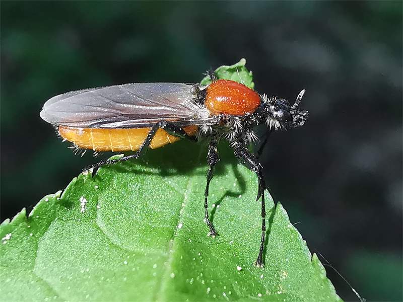 Thorax: Scutum des Männchens schwarz, des Weibchens orangerot; Flügel der Männchen klar, der Weibchen dunkel; Weibchen seitlich mit weißen Haaren; Flügelader rm kürzer als Ader rs; Beine schwarz.