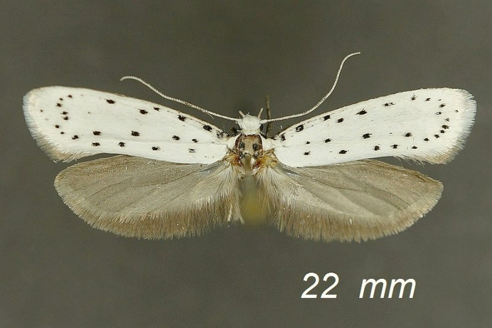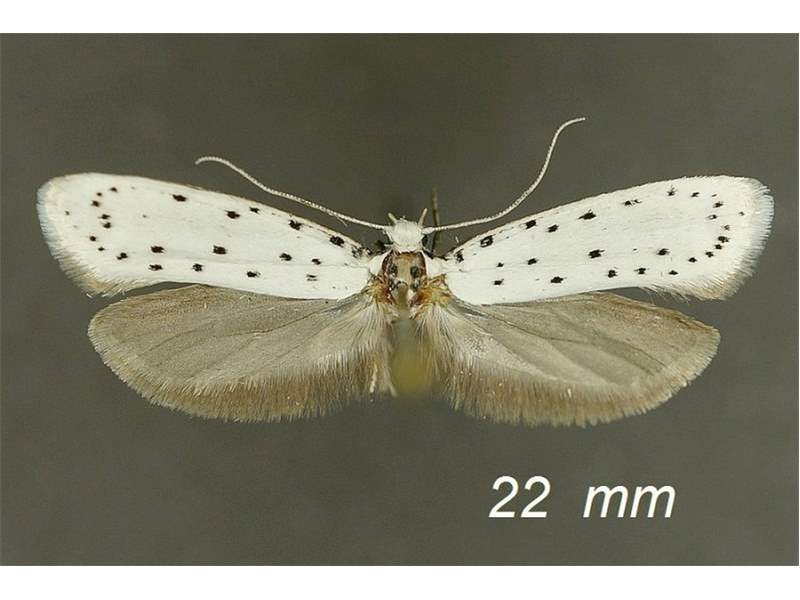Beleg und Zuchtfalter von Yponomeuta padella, Raupen Mitte Mai 2002 an Schlehen aus der Umgebung von Radibor eingetragen. Falter am 22. Juni 2002 geschlüpft