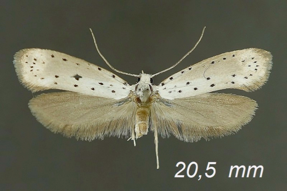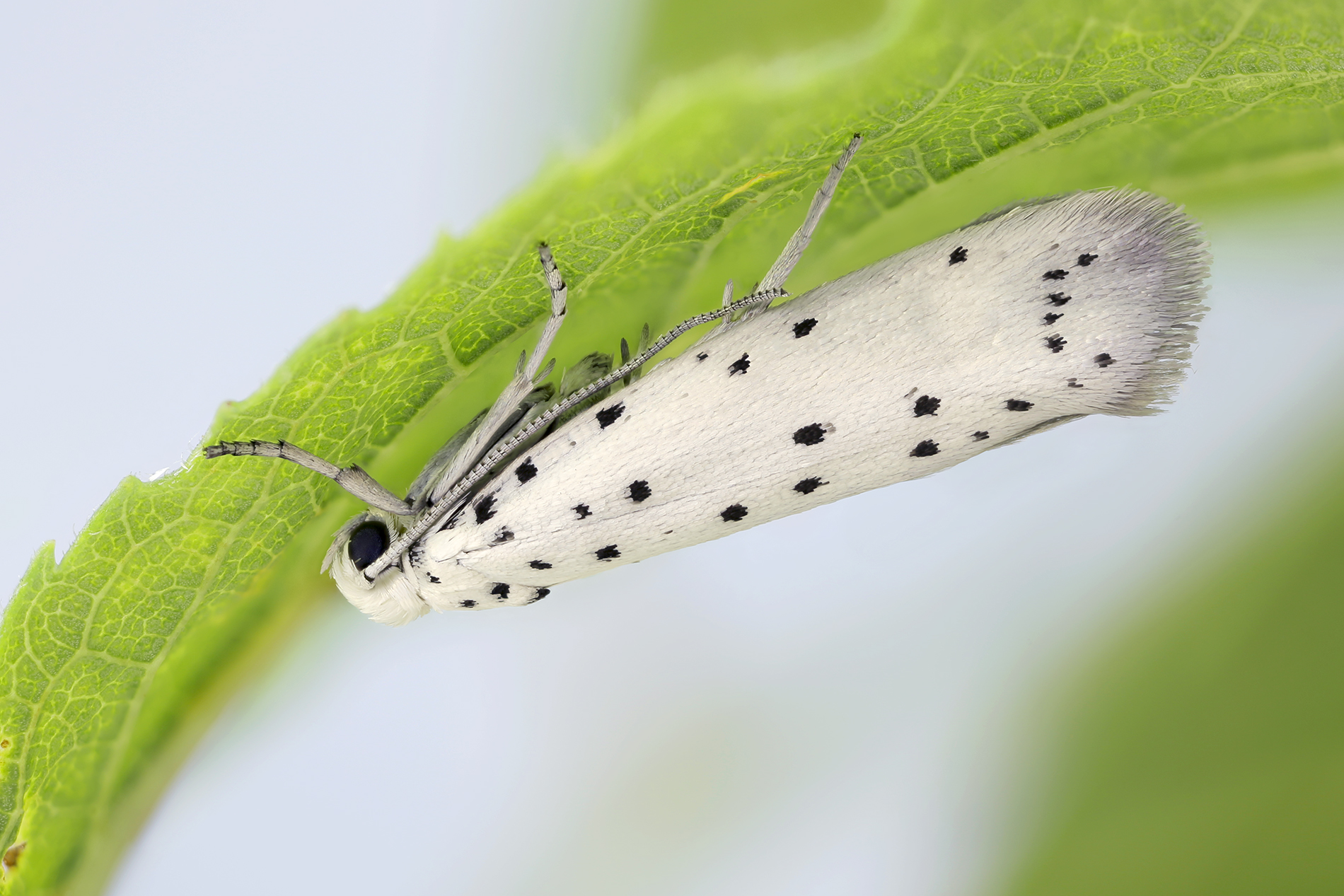 Yponomeuta padella-Falter, der am 17. Juni aus einer am 8. Juni 2014 in Radebeul an Schlehe gefundenen Raupe gezogen wurde.