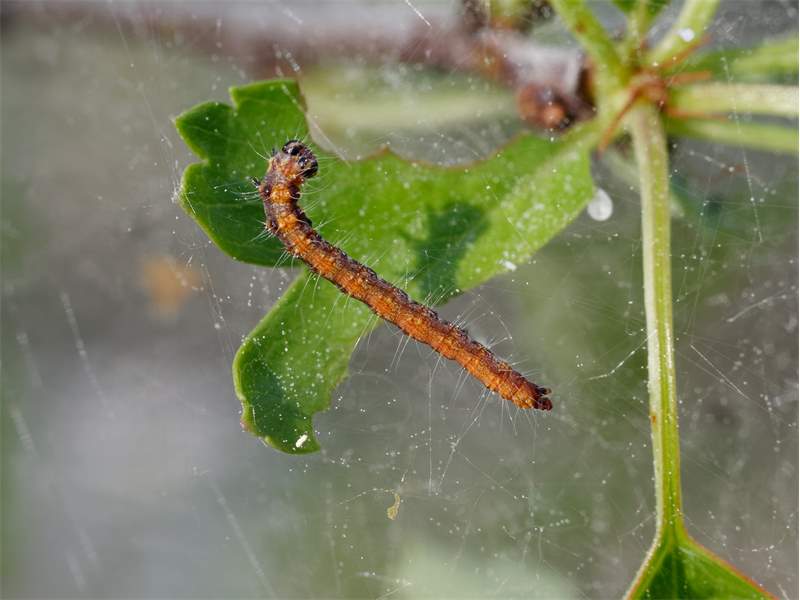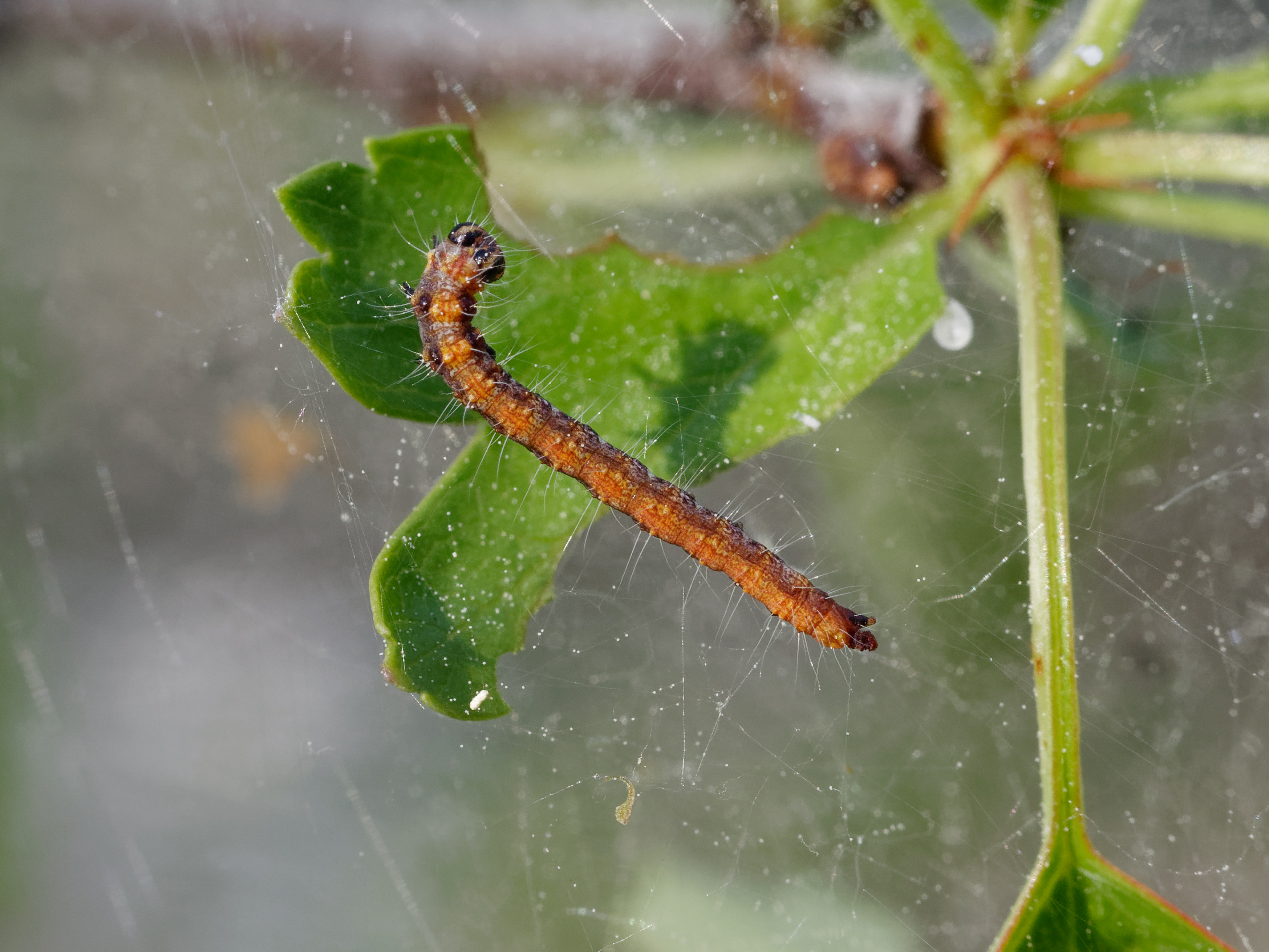 Ausgewachsene Larve 12 mm lang; Kopf schwarz mit braunen und weißlichen Linien; Körper rot- und graubraun gesprenkelt; Dorsalstreifen heller, ockergelb auf den ersten beiden Segmenten; Nachschieber (=letztes Beinpaar) tief rotbraun.