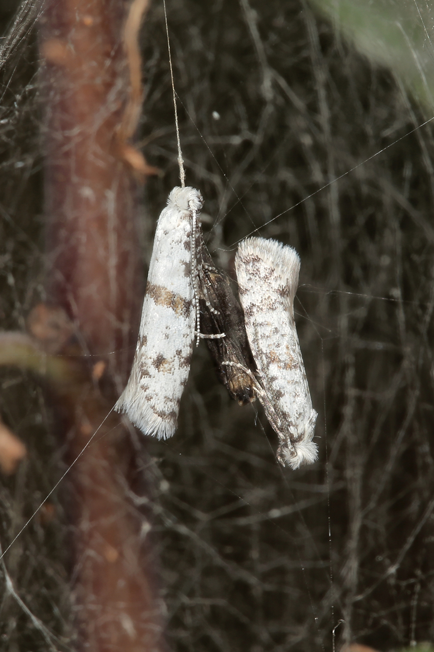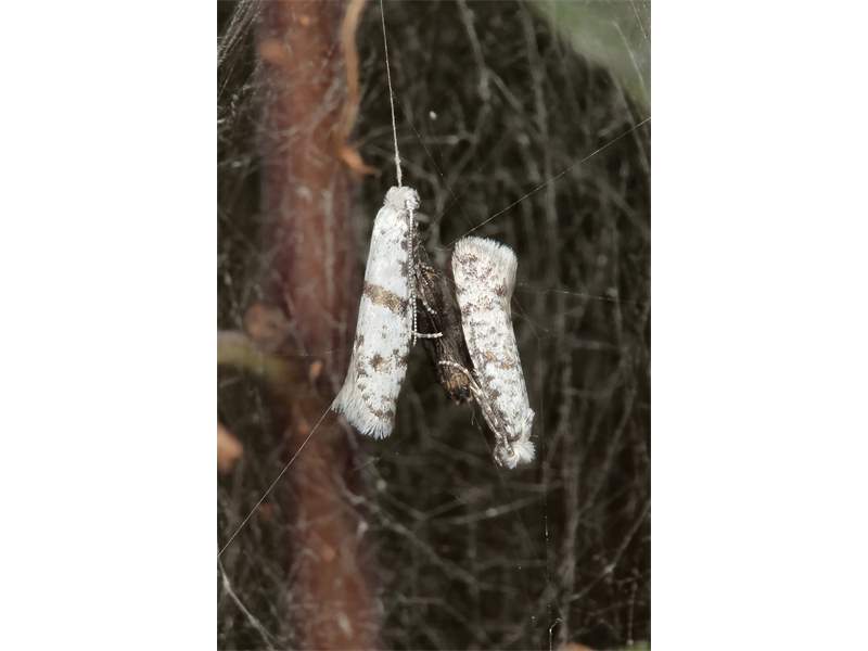 Frisch geschlüpfte Scythropia crataegella-Falter im ehemaligen Larvennest an Prunus spinosa sitzend. Gefunden am 18.08.2013 in Radebeul-Zitzschewig