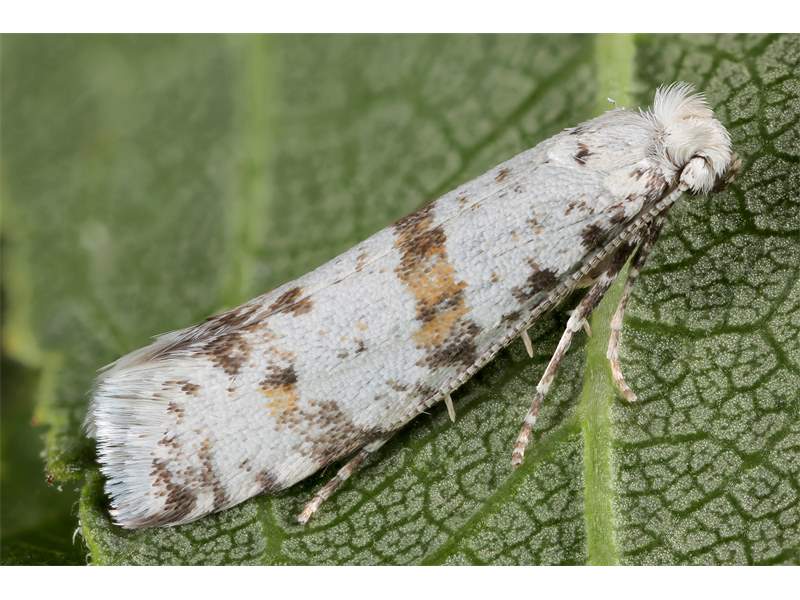 Flügelspannweite 11–15 mm; Vorderflügel weiß; Costa an der Basis braungrau; Binde aus braunen und orangefarbenen Schuppen, die von dorsal (1/3 Vorderflügel) nach costal (1/2 Vorderflügel) verläuft; eine Reihe braugrauer Flecken im Bereich des Termen (am weitesten vom Körper entfernter Rand des Flügels) und Tornus (nach posterior [=hinten] zeigende Flügelecke); Fransensaum gräulich-weiß.