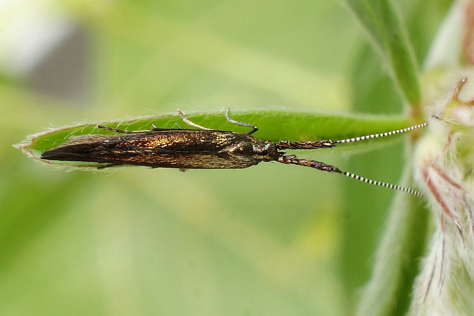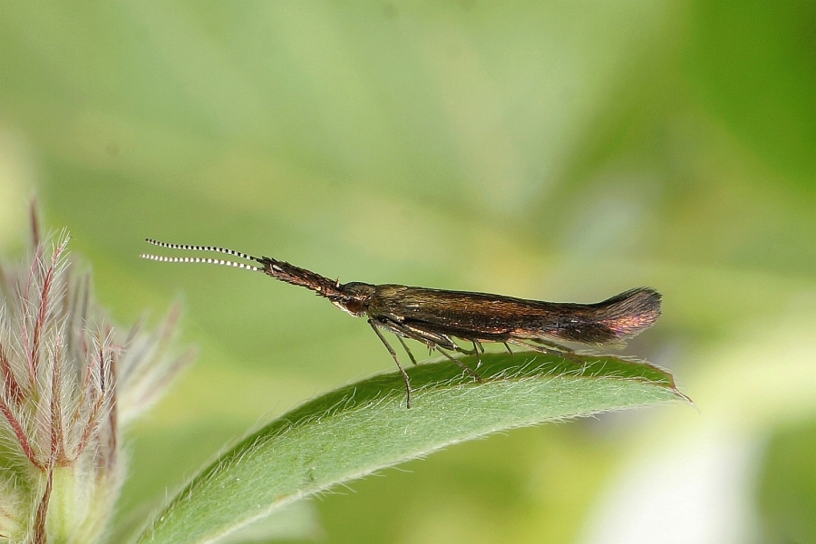 Kopf, Thorax und Vorderflügel oberseits metallisch olivgrün, von kupfer- bis bronzefarben glänzend. Fühler auf ihrem basalen Drittel durch metallisch braune bis violette Schuppen verdickt, der äußere Teil deutlich schwarz und weiß geringelt. Von der aus Deutschland nicht bekannten