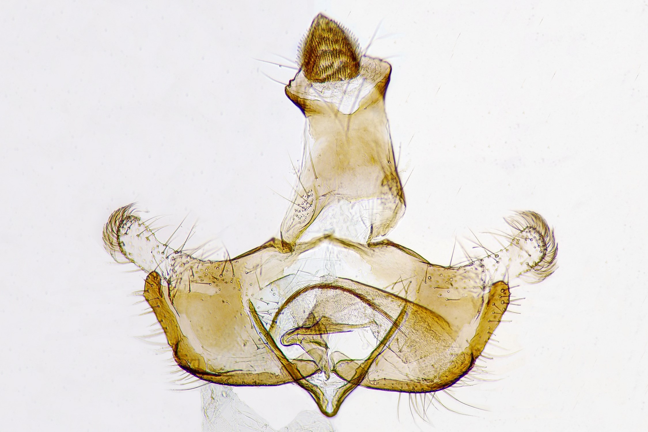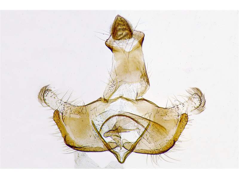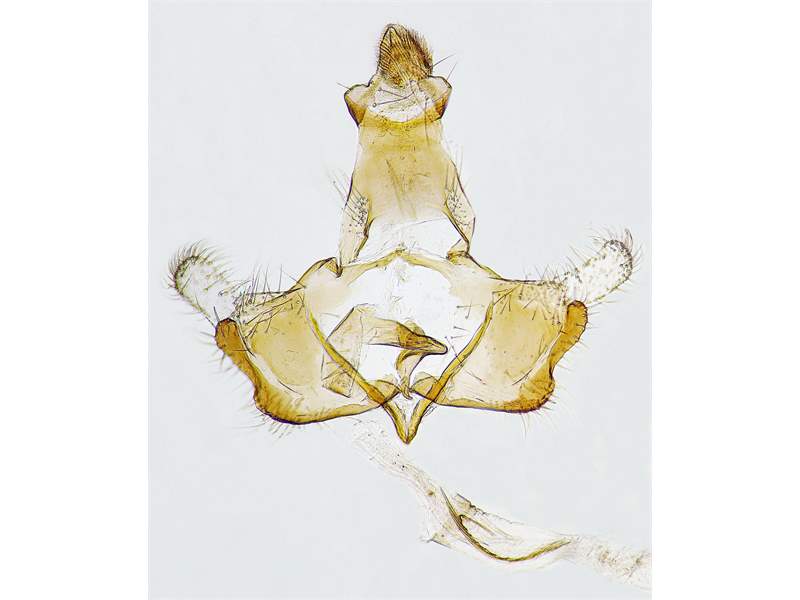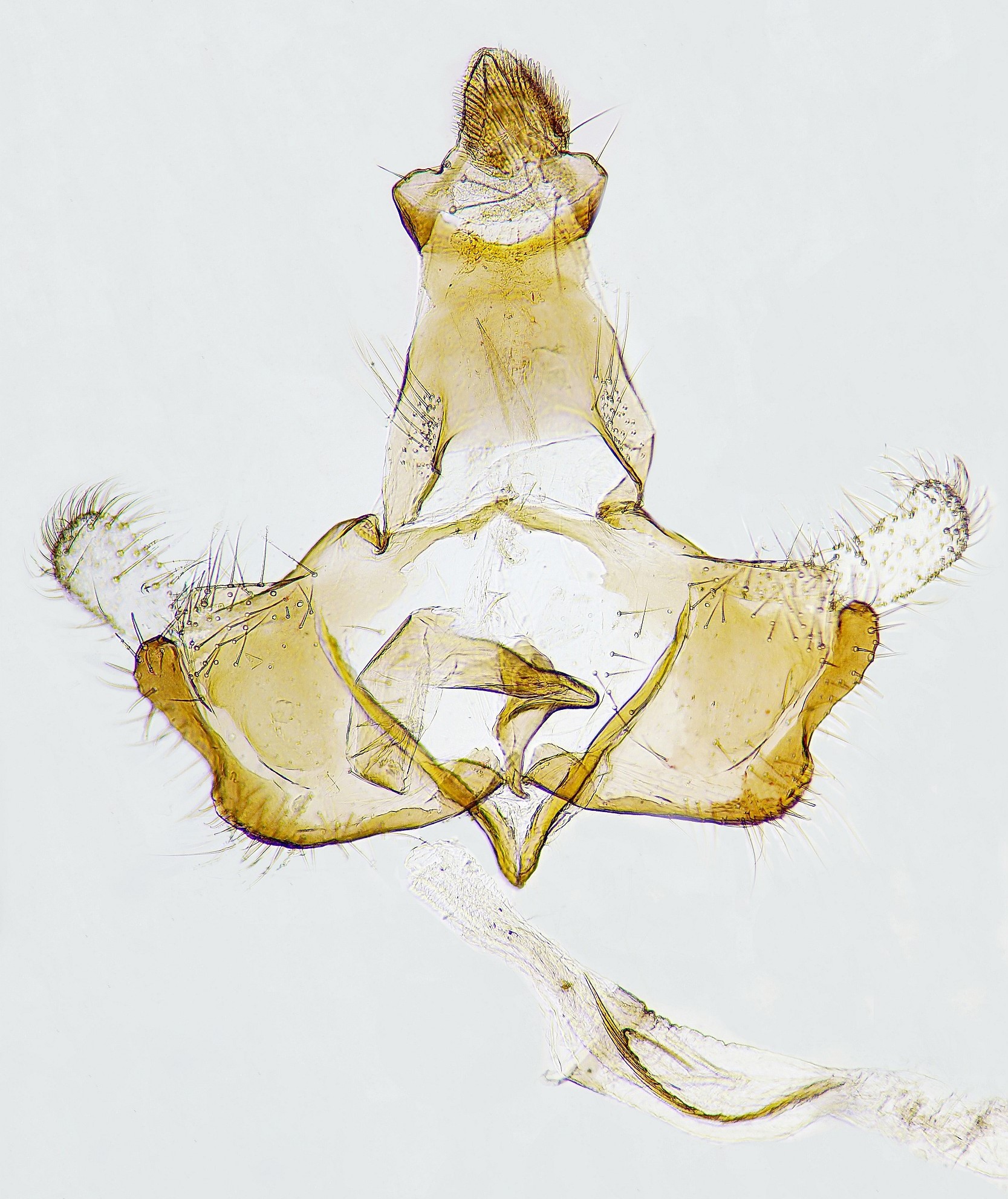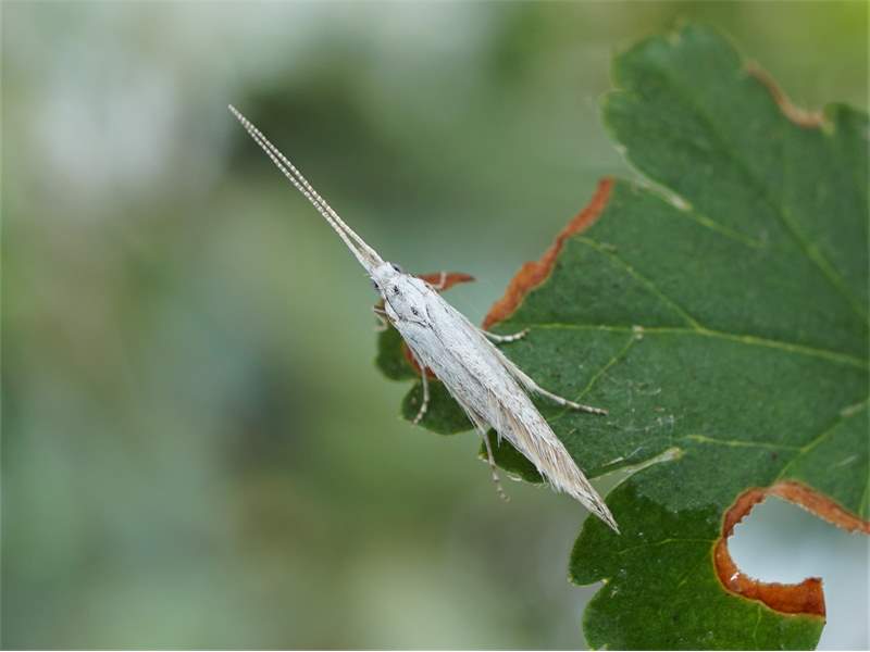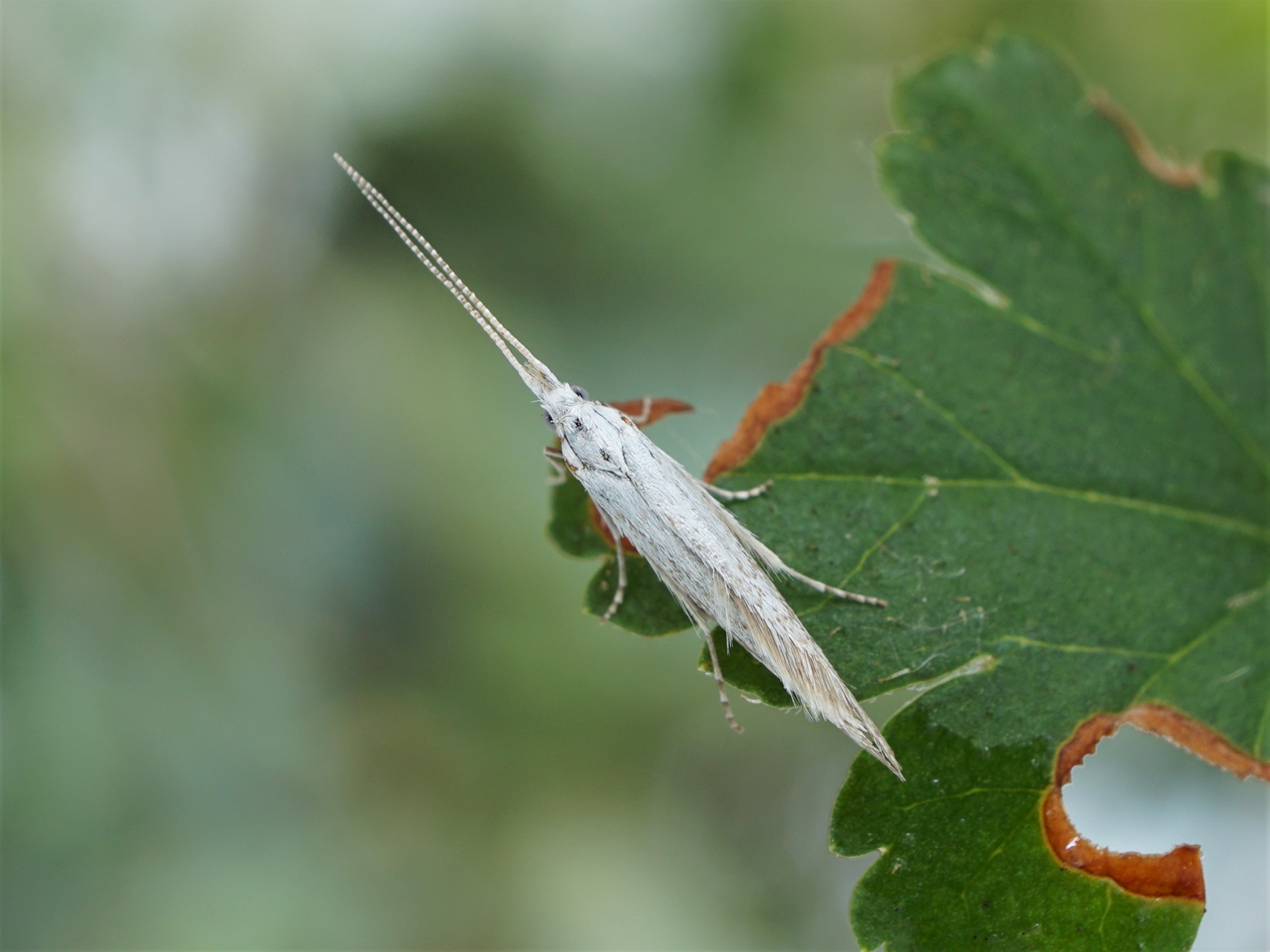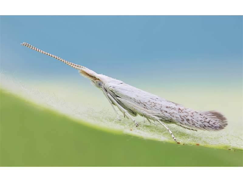 Flügelspannweite 12.5–17 mm. Kopf weiß. Antennen weiß-braun geringelt. Scapus ventral mit Büschel aus weißen und braunen Schuppen. Thorax weiß. Vorderflügel weiß, mit unregelmäßig verteilten graubraunen Schuppen, die in ihrer Zahl in Richtung Termen zunehmen. Costa an der Basis dunkelbraun. Hinterflügel grau. Beine weiß. Tarsenglieder der Mittel- und Hinterbeine an der Basis braun. Abdomen dorsal grau glänzend, ventral hellgrau.
