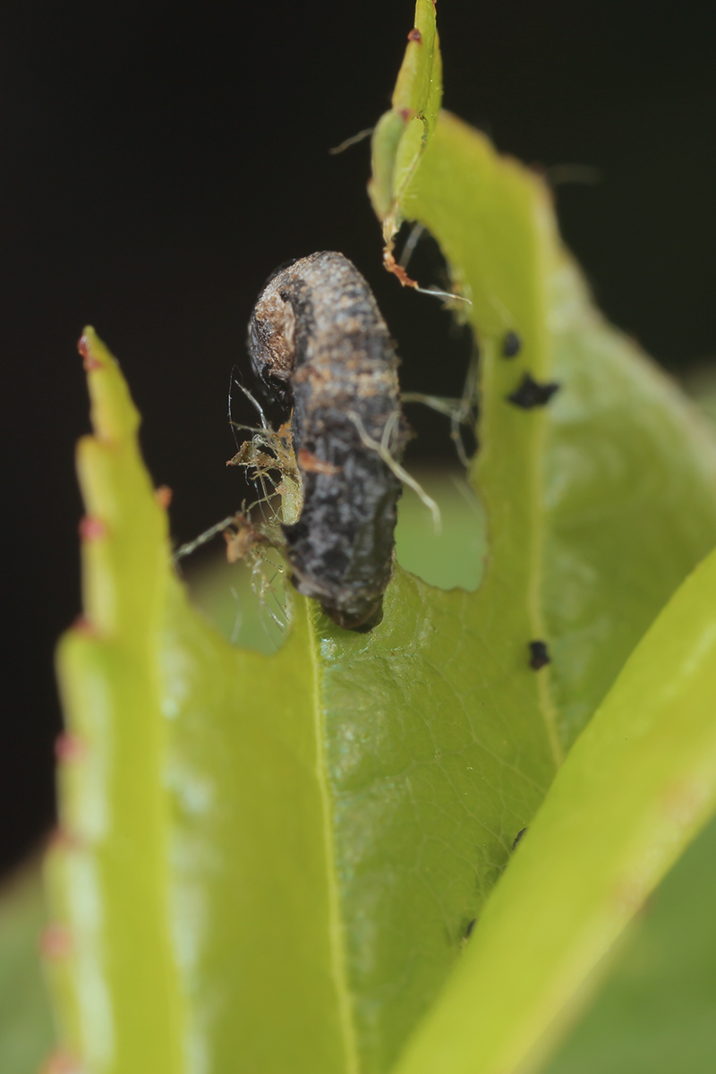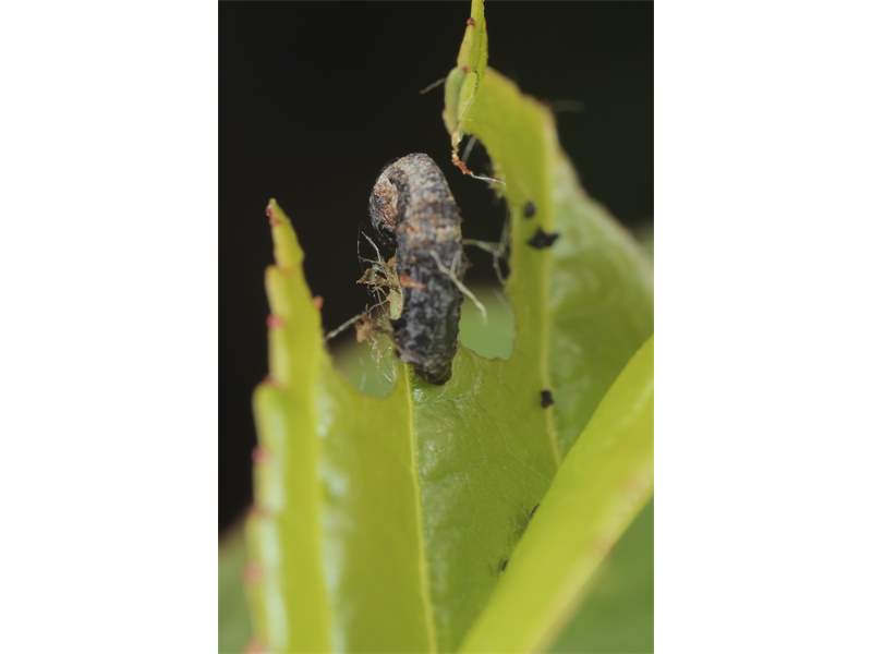 Die ausgewachsene Larve hat einen schwarzen Kopf und einen schwarzen Halsschild, der in der Mitte tief gefurcht ist. Die auf den dahinterliegenden Thoraxsegmenten befindlichen Sklerite sind ebenfalls schwarz. Ihr Körper ist hellgelb, die Thoraxsegmente bräunlich. Der Darm erscheint grün. Die Brustbeine haben die gleiche Farbe wie der Körper. Die Larve besitzt 3 Bauchbeinpaare.