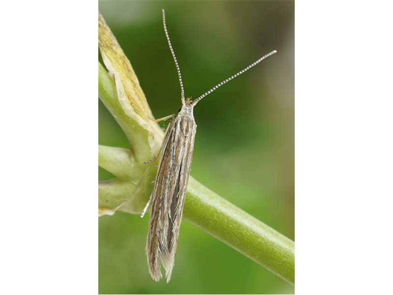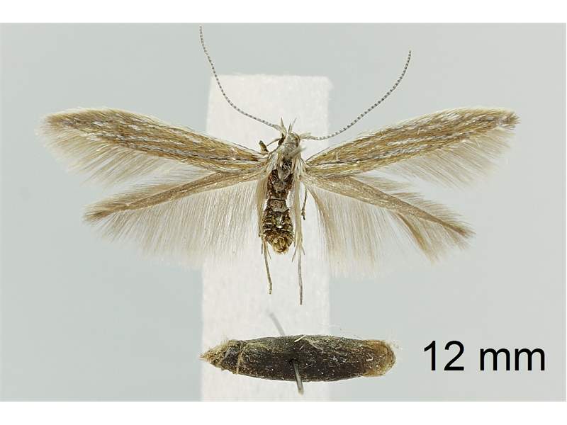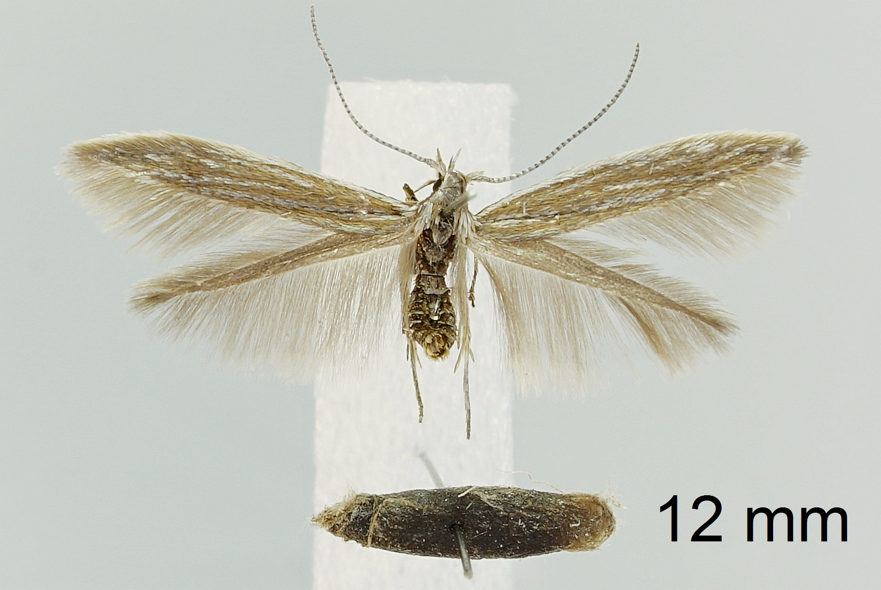 Falter von Coleophora squamosella, erhalten aus im Herbst 2005 in einer ehemaligen Kiesgrube bei Hainewalde an den Blüten- und Samenständen vom Scharfen Berufskraut ( Erigeron acer) eingeholten Raupensäcken. Falter am 20.Juni 2006 geschlüpft (© Friedmar Graf)( Bild vergrößern)