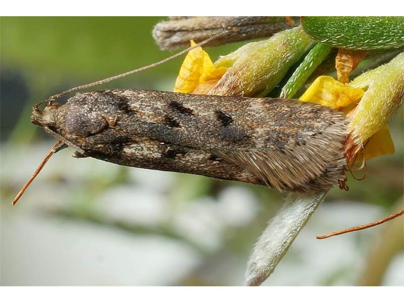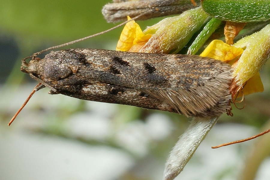 Prolita solutella ist ein Bewohner von Besenginster- oder Calluna-Heiden mit eingelagerten Vorkommen des Heideginsters (Genista pilosa). (F. Graf)