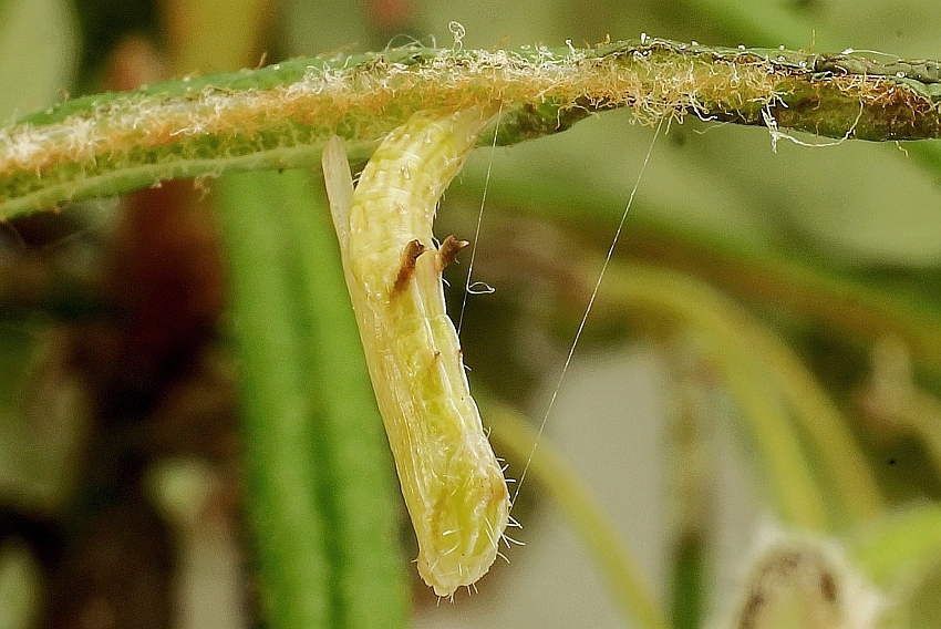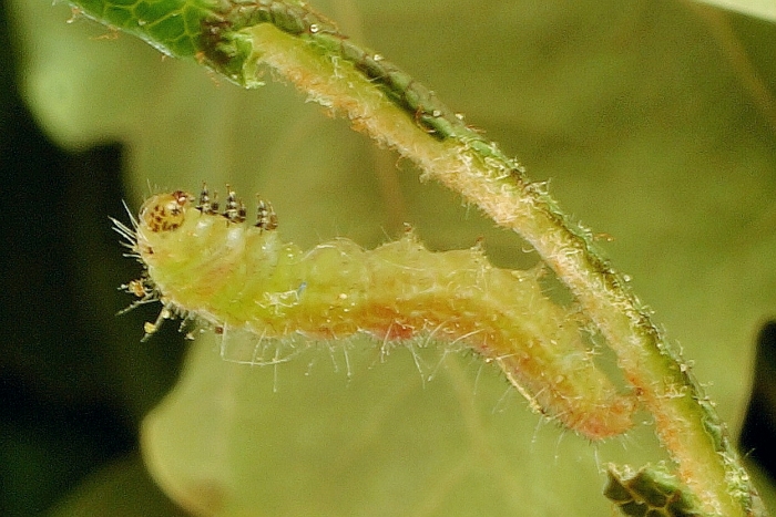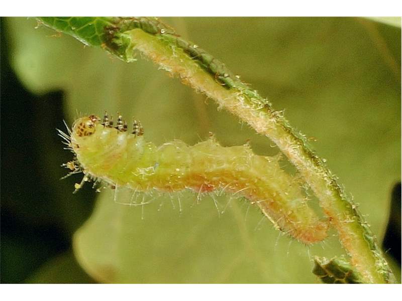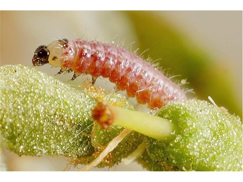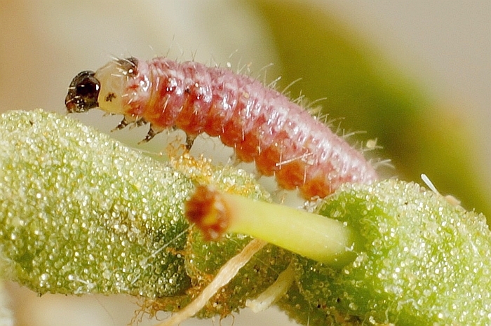 Die Larve frisst an Heidekrautgewächsen (Ericaceae), unter anderem an Heidekraut (Calluna vulgaris), Sumpfporst (Rhododendron tomentosum, Syn.: Ledum palustre) und Grauer Glockenheide (Erica cinerea).