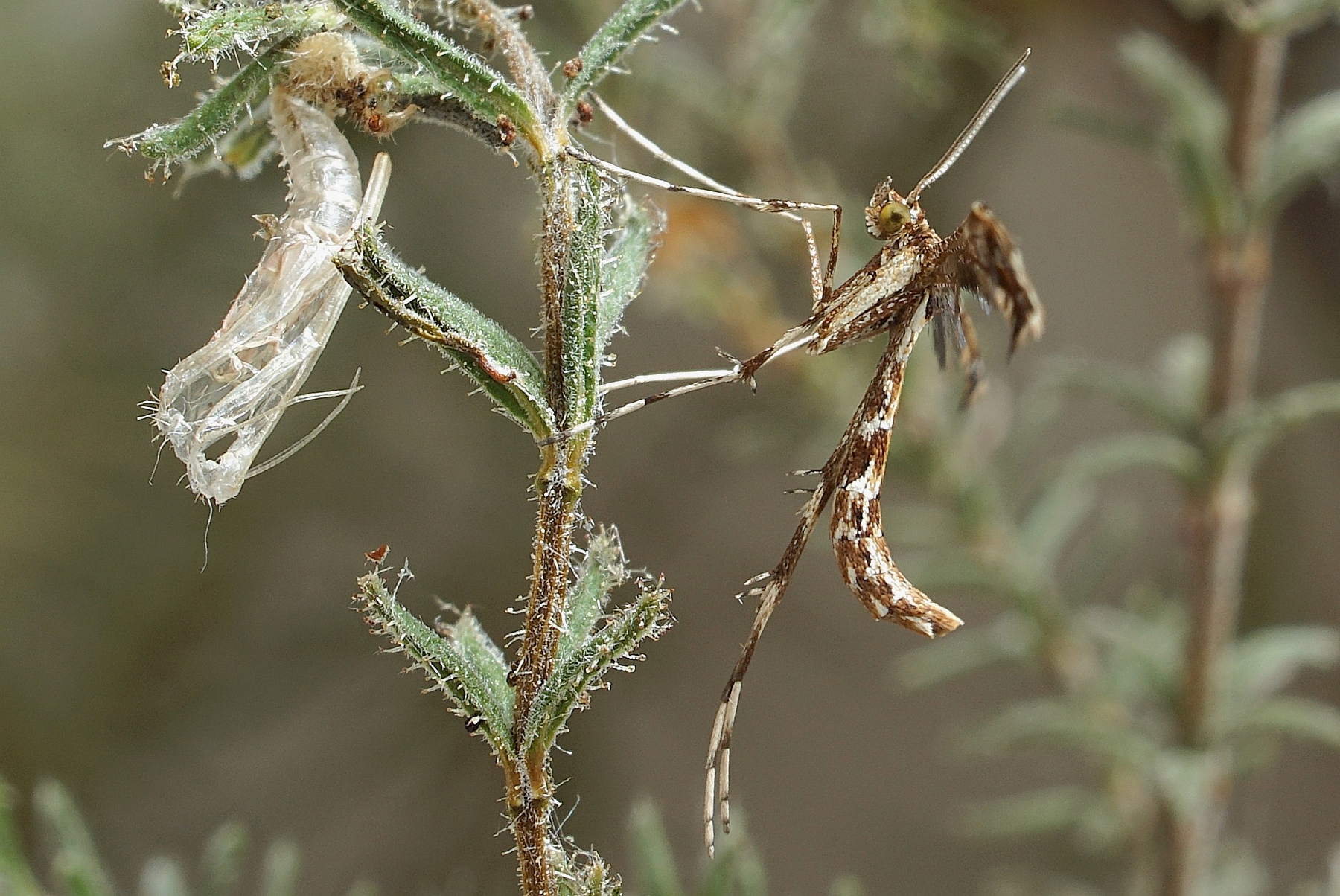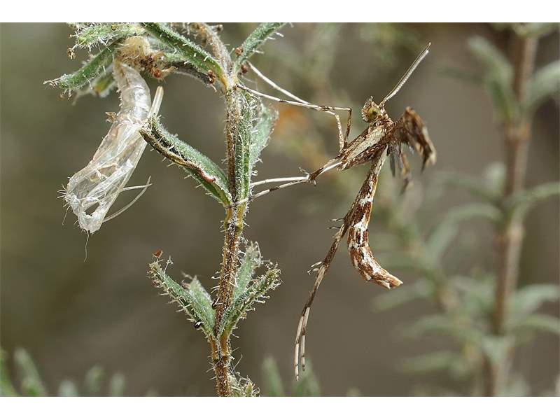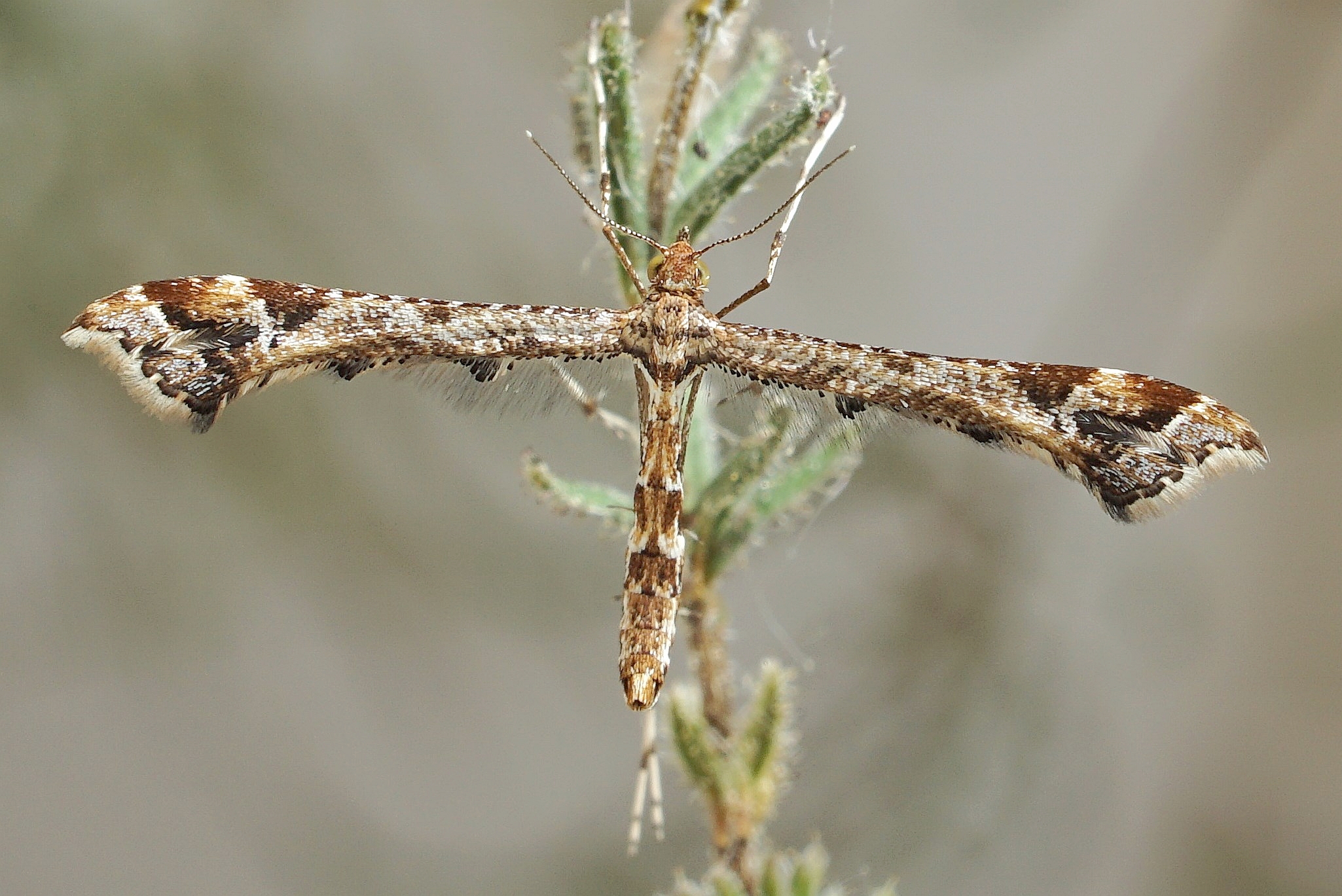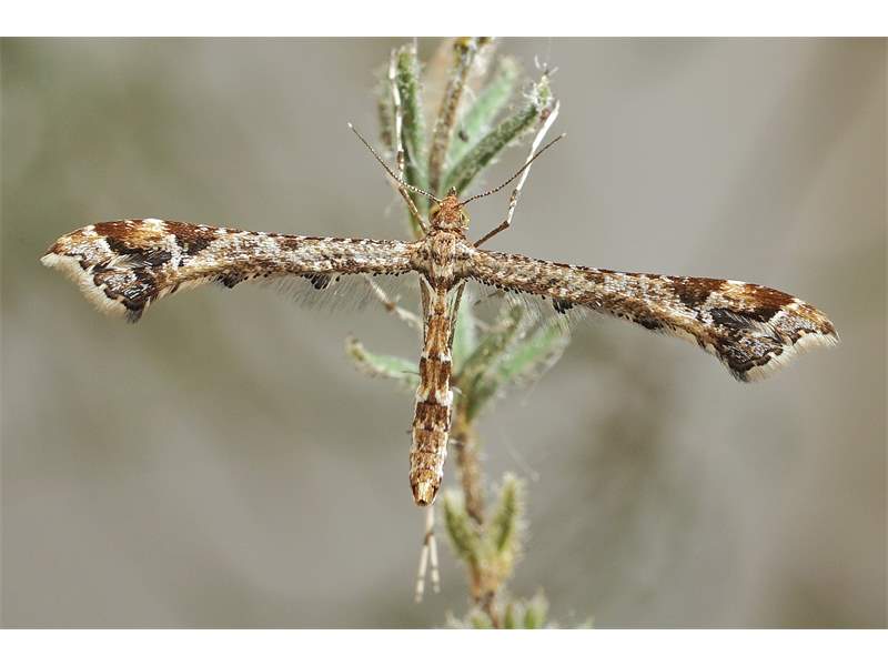 Amblyptilia acanthadactyla fliegt auf Heide- und Moorstandorten.