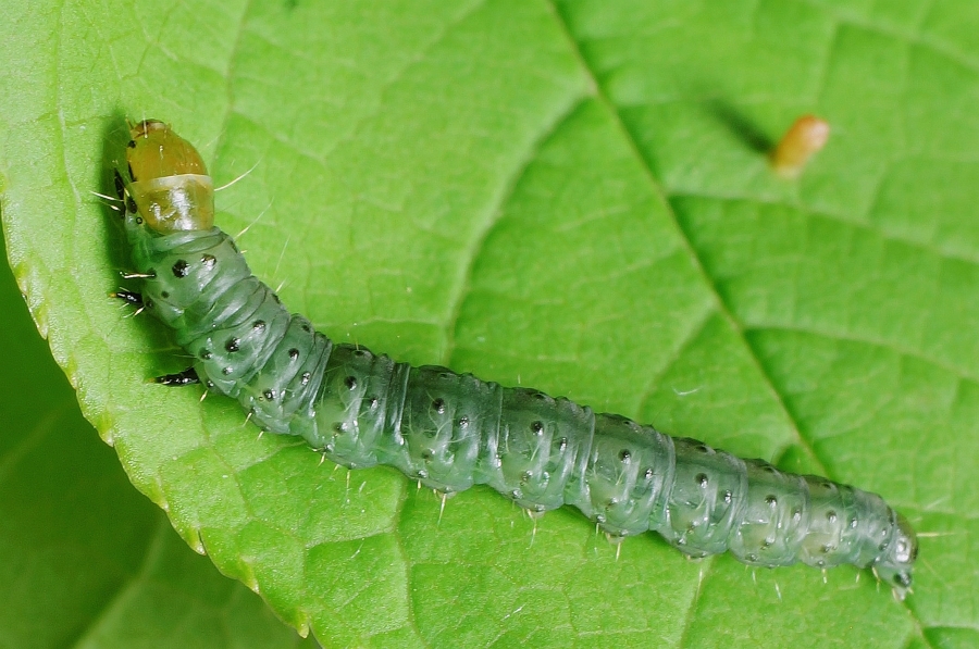 Larve von Eudemis porphyrana, eingetragen Anfang Mai in einer Blattrolle der Traubenkirsche (Prunus padus). Aus einem Feldgehölz bei Guttau.