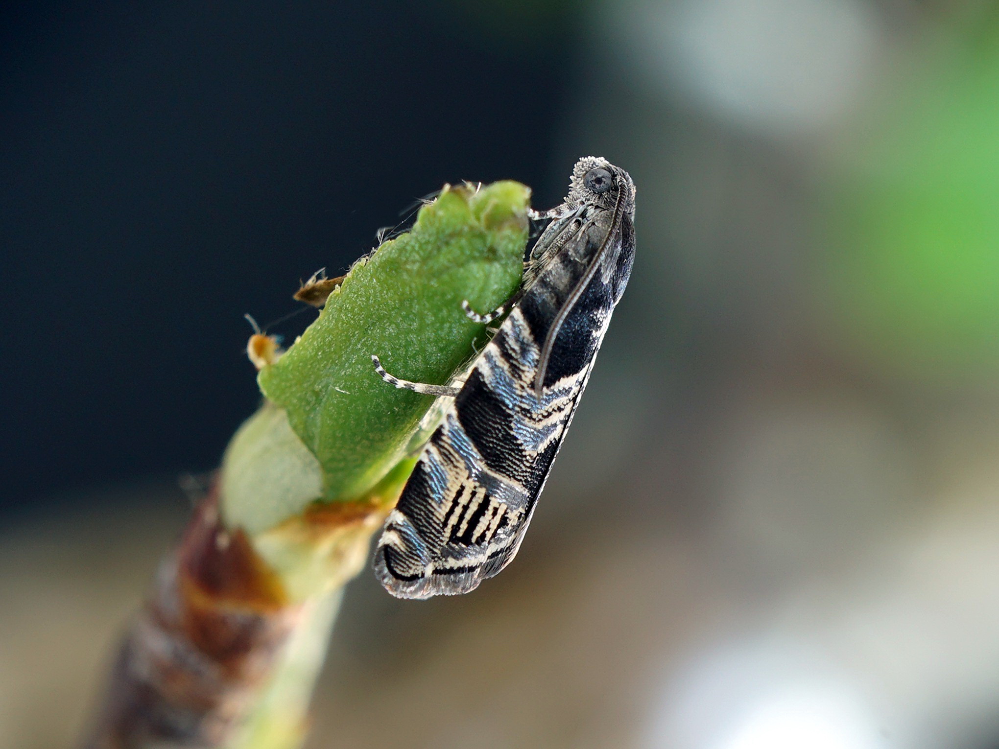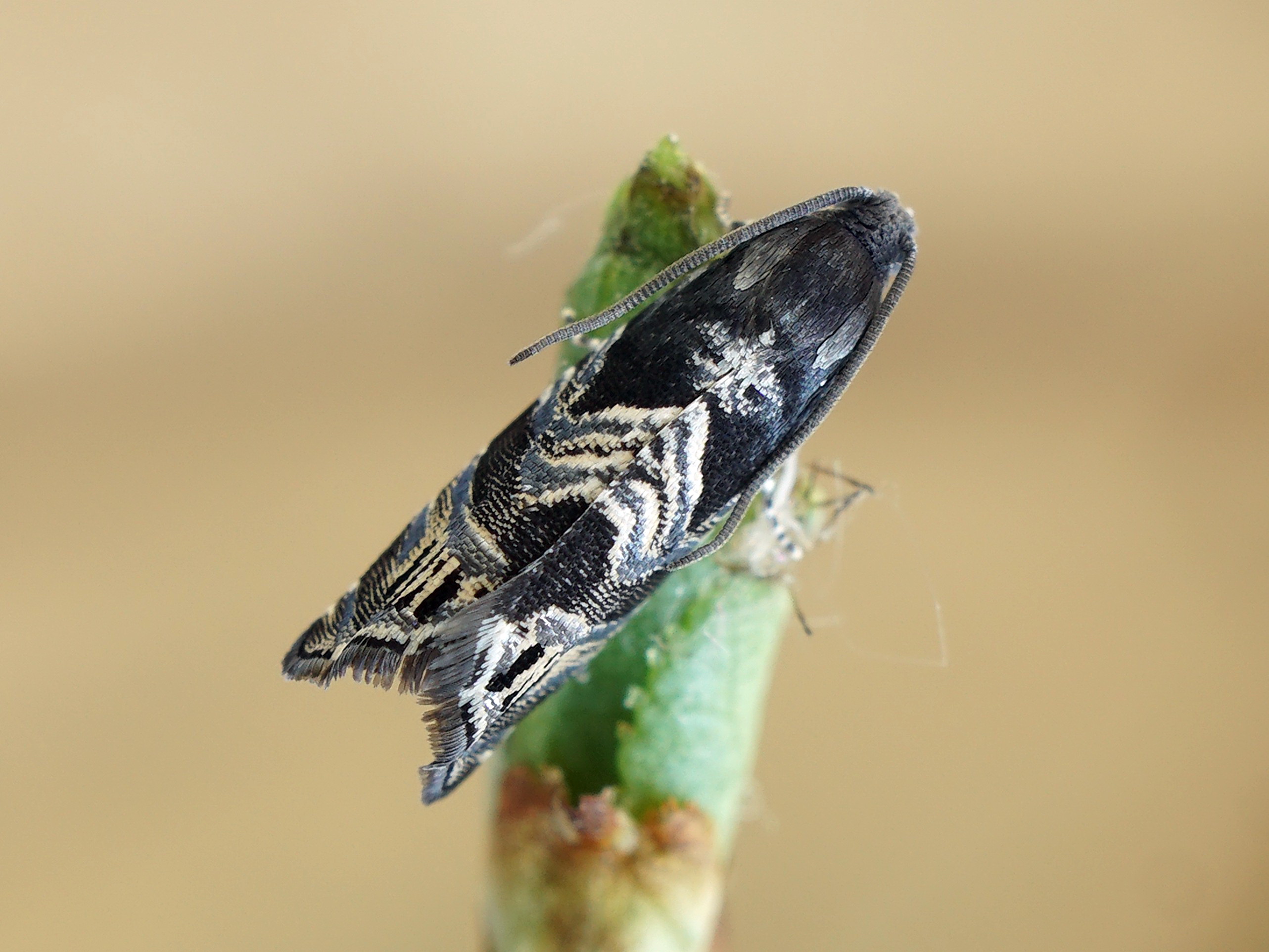 Die Larve lebt vom Sommer an in alten, vom Kleinen Pappelbock (Saperda populnea) verursachten Anschwellungen der Espenzweige in einer mit Mulmteilchen bekleideten Röhre. Sie weidet vor dem Schlupfloch des Käfers die grüne Rinde fleckartig ab und überzieht die Fraßstelle mit einer Gespinstdecke, in welche Kot und Fraßstückchen verwebt sind. Die Decke zerfällt, durch Witterungseinflüsse verursacht, sobald sich die Larve zur Überwinterung zurückzieht. Die Verpuppung findet unter Freilandbedingungen etwa im April statt (F. Graf).