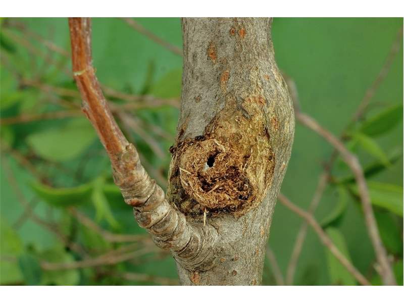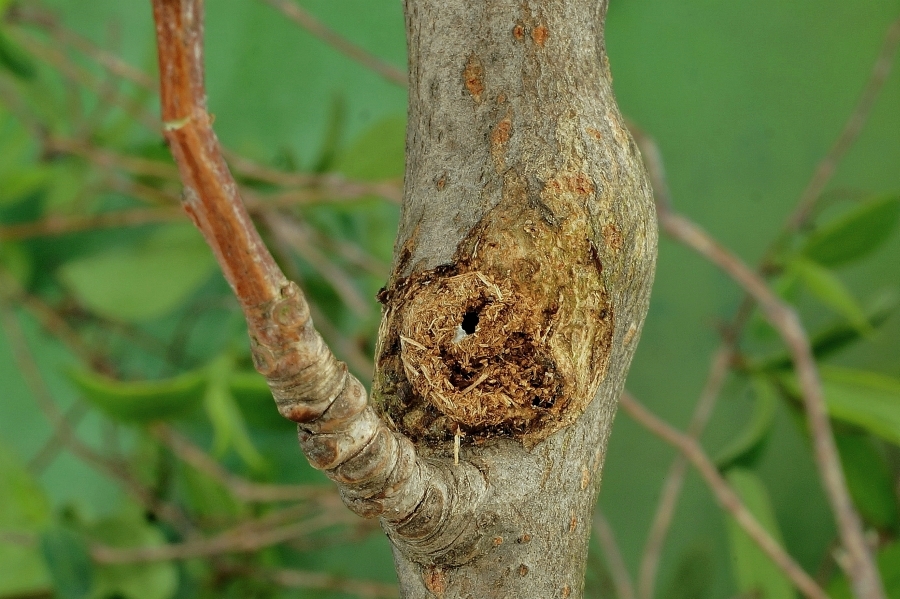 Von der Larve bewohnte Zweiganschwellung eines Espenzweiges, zu sehen ist das Ausschlupfloch und die Rindenweide. Der Falter schlüpfte am 19. März 2014.