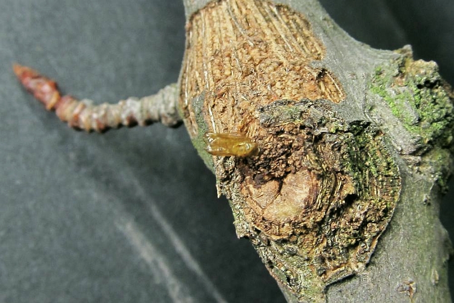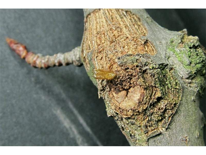 Vom Kleinen Pappelbock verursachte Astanschwellungen an Espe, in welchen die Larve von Cydia corollana lebt. Februar 2011, Waldweg mit Espenaufwuchs in der Umgebung von Boxberg. Fotografiert nach dem Schlupf des Falters. In der Bildmitte ist die Exuvie zu sehen