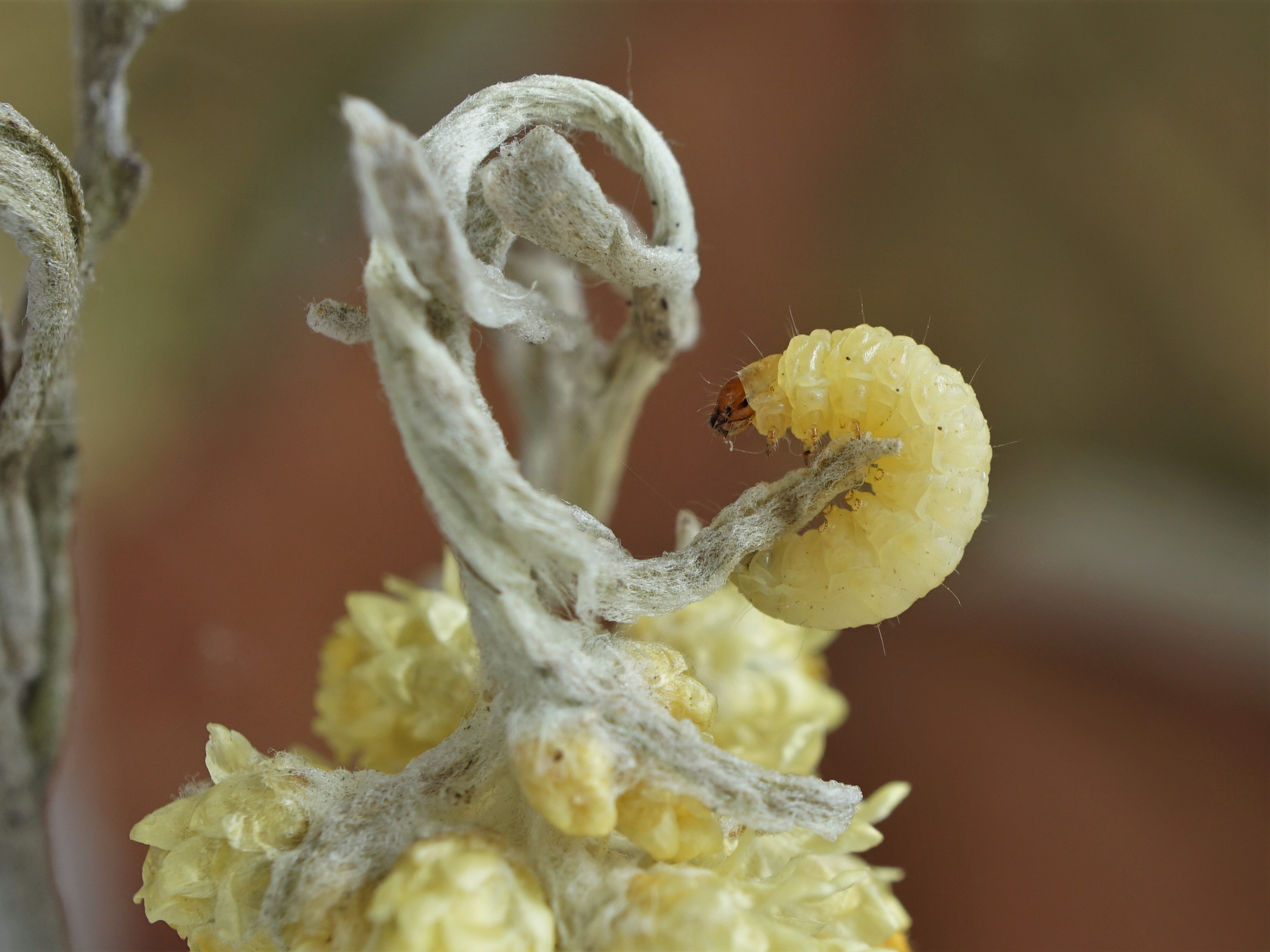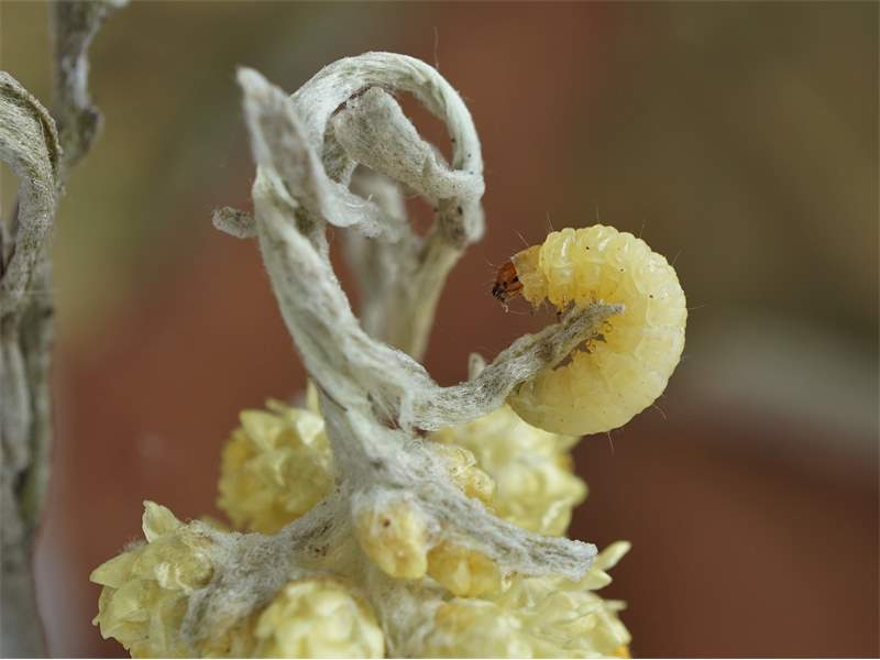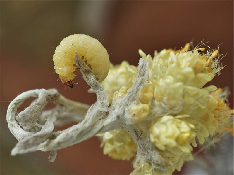 Boxberg/O.L. - Raupe Anfang September 2022 in Fruchtständen von Sandstrohblume. e.l. 5. Mai 2023