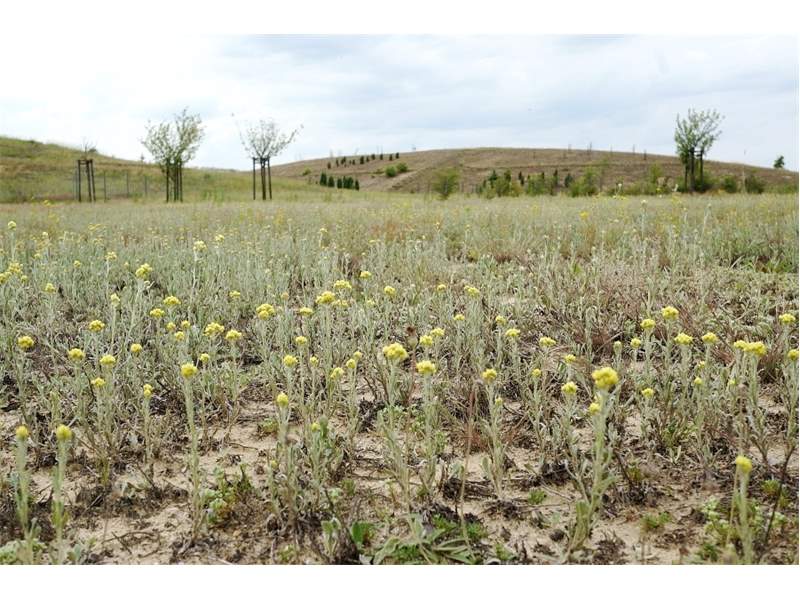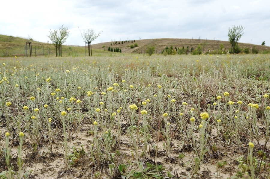 Lebensraum von Eupoecilia cebrana: trockener Sandboden mit Beständen von Sandstrohblume (Helichrysum arenarium). Rekultivierungsfläche in der Umgebung von Nochten