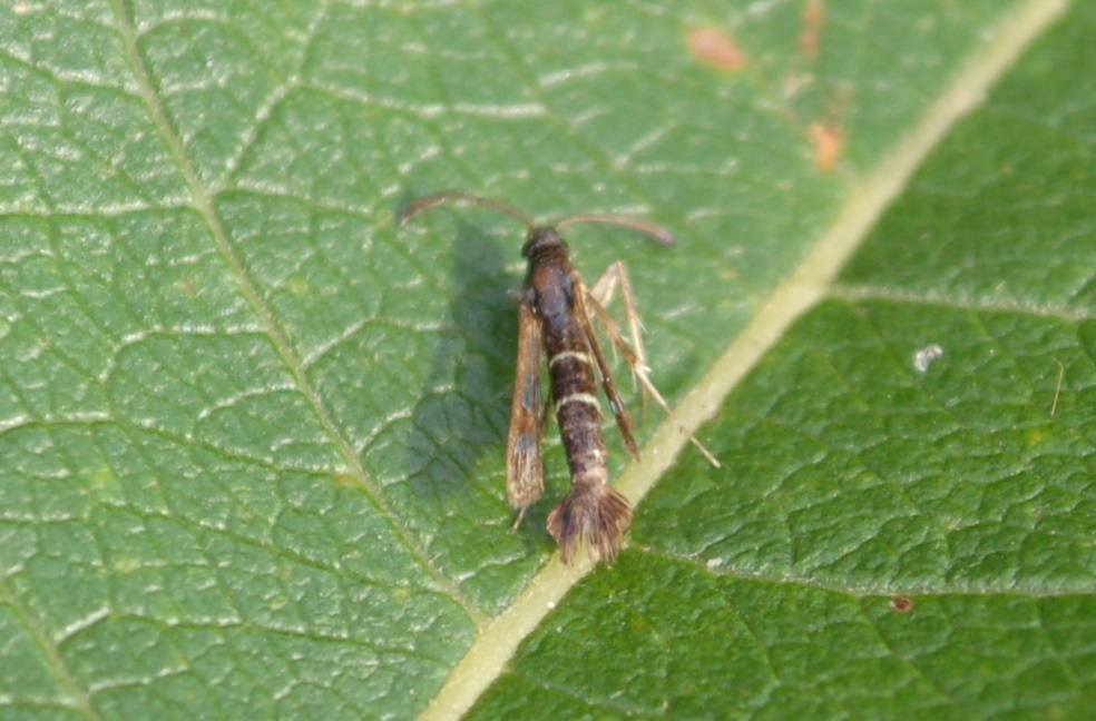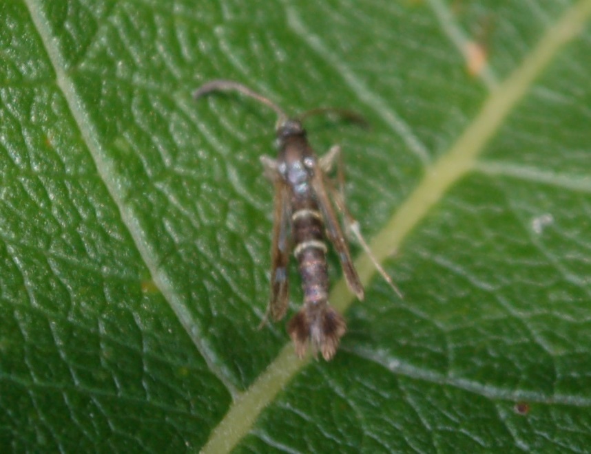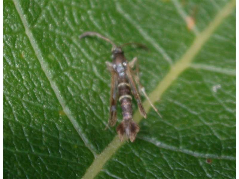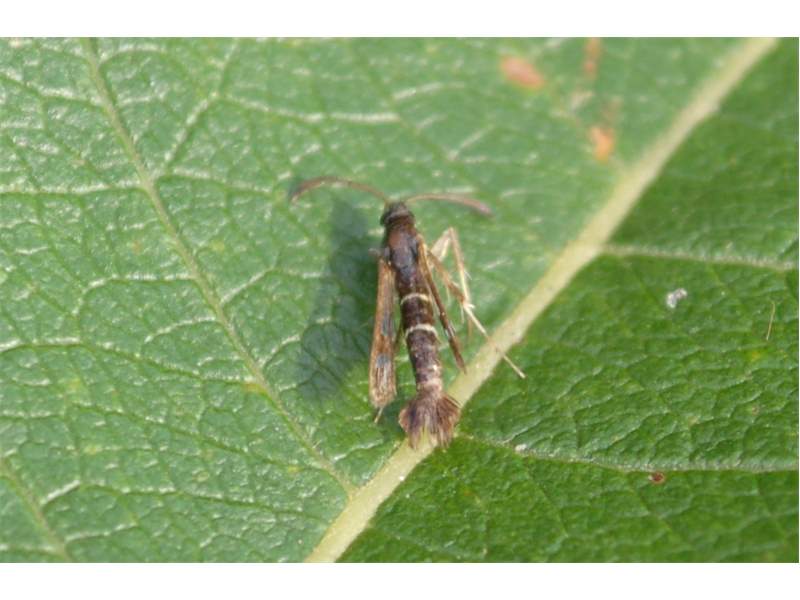 Gelbbauch-Glasflügler (Synanthedon flaviventris (Staudinger, 1883)), Imago am Pheromon, die helle Unterseite war deutlich zu erkennen, Glauchau, Juli 2017