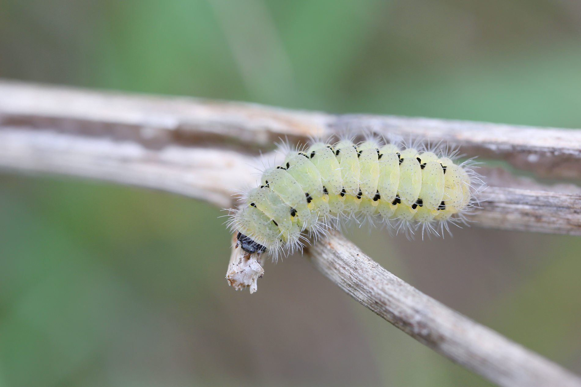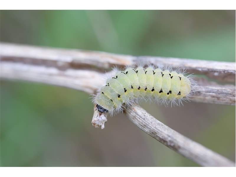 Die unverwechselbare Raupe ist oliv- oder gelblichgrün in der Grundfarbe und besitzt subdorsal pro Segment 2 schwarze und einen gelben Fleck.