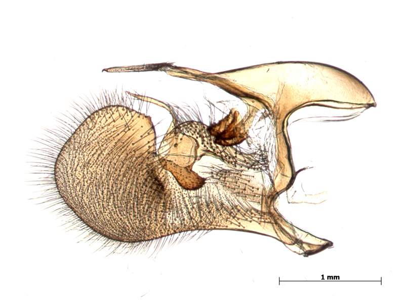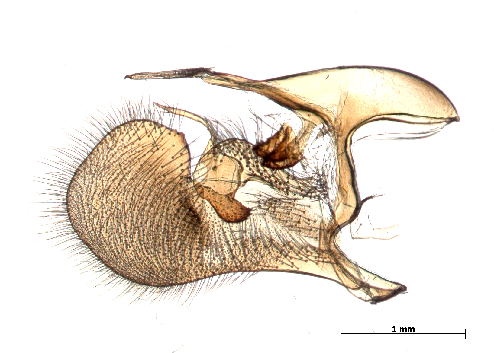Männliches Genital: Uncus distal mit Haken, paarige Gnathos posterior jeweils dreieckig sklerotisiert und die dorsale Kante gezähnt, Cucullus (distales Valvenende) großflächig, die vom Costalrand der Valve nach ventral gerichtete Sklerotisierung am Ende gezähnt. Phallus anterior deutlich nach oben gebogen und verjüngt; die posterio-ventrale Verjüngung am Ende wieder leicht verdickt und nach dorsal gebogen.