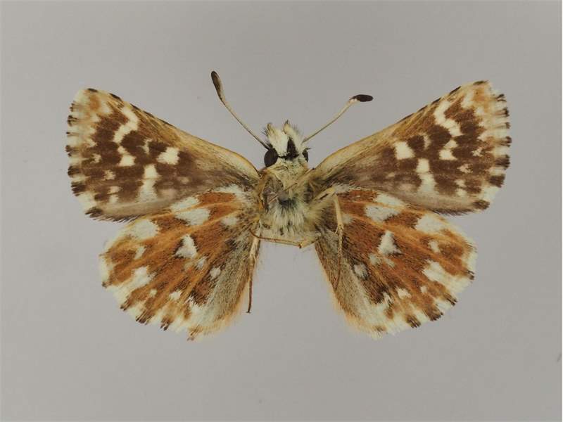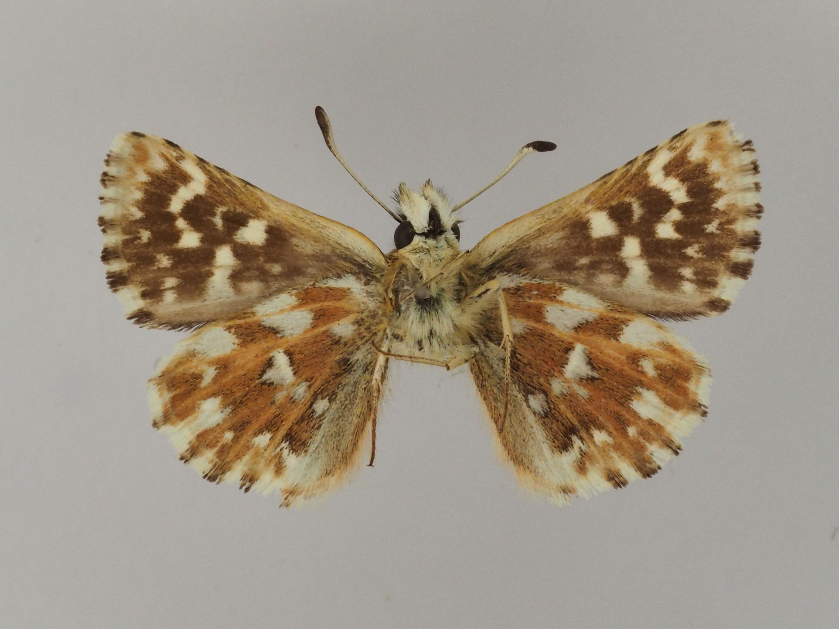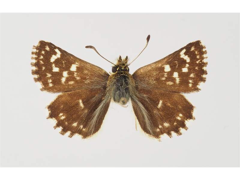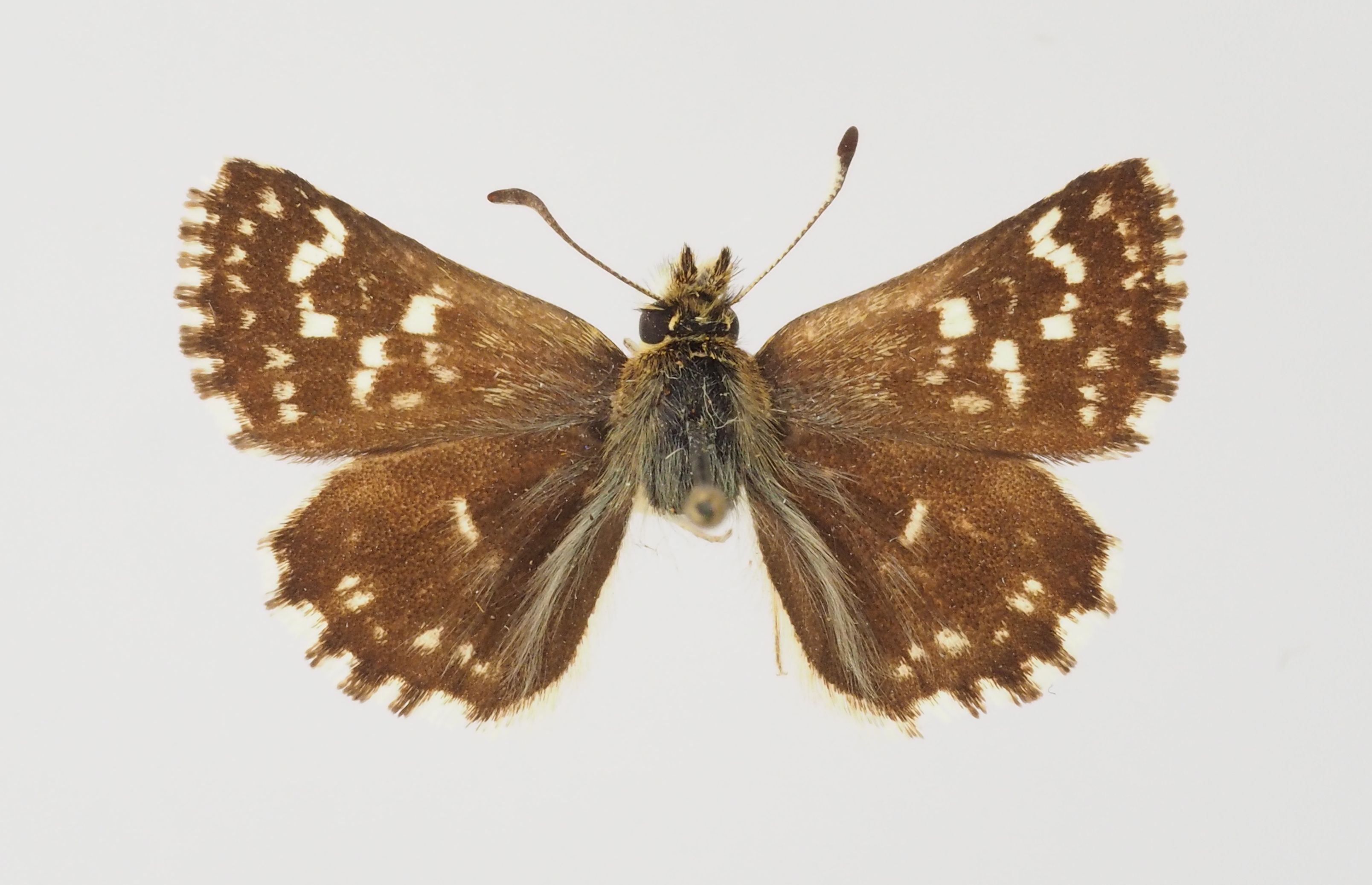 Flügeloberseiten dunkelbraun mit kontrastreichen, weißen, eckigen Flecken und am Rand mit schwarz-weiß gescheckten Fransen. Vorderflügel vor dem Außenrand mit einer schwächeren und einer deutlicheren weißen Punktreihe, die vollständig voneinander getrennt sind.