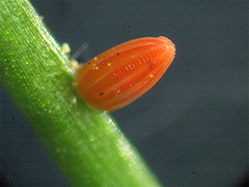 Ei des Aurorafalters, das sich wenige Tage vor dem Schlüpfen der Larve dunkelorange verfärbt. Weißensand im Mai 2011 an Wiesenschaumkraut