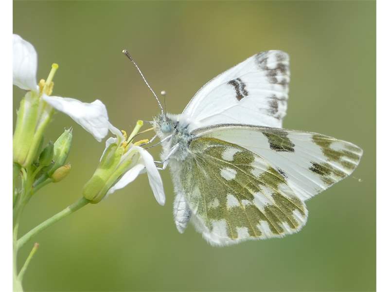 Flügel mit weißer Grundfarbe. Oberseits die Vorderflügel mit grauem bis schwarzem Fleckenmuster in den Flügelspitzen sowie einem ebenso gefärbten Mittelfleck, der von einer feinen weißen Linie durchzogen ist. Sexualdimorphismus: Weibchen mit ausgedehnterem dunklen Fleckenmuster und mehr gerundeten Vorderflügelspitzen. Saisondimorphismus: Frühjahrsgeneration mit blasserem Fleckenmuster auf den Oberseiten, die Sommergeneration mit kontrastreicherem schwarzen Muster. Fleckenmuster der Flügelunterseiten olivgrün.