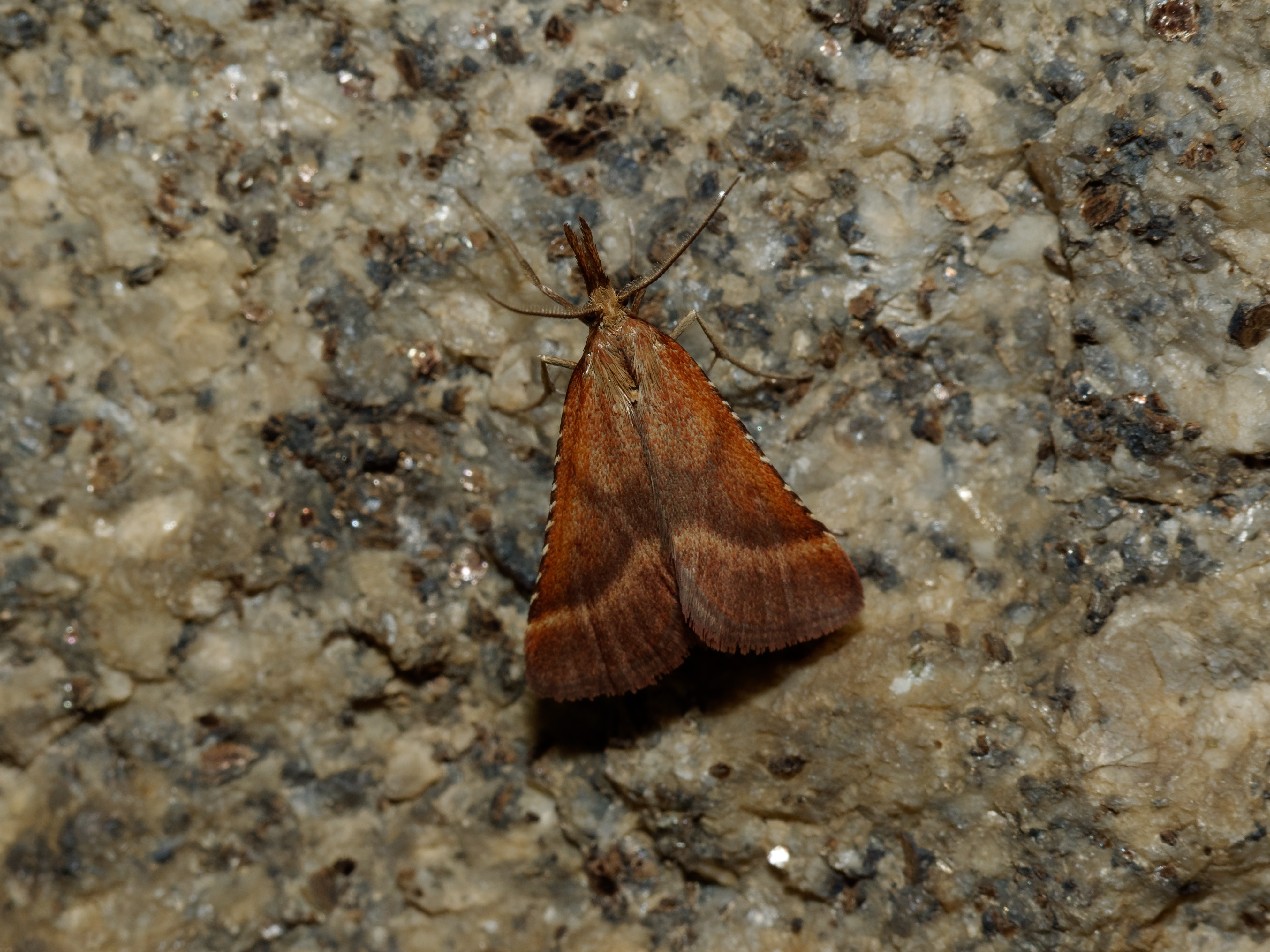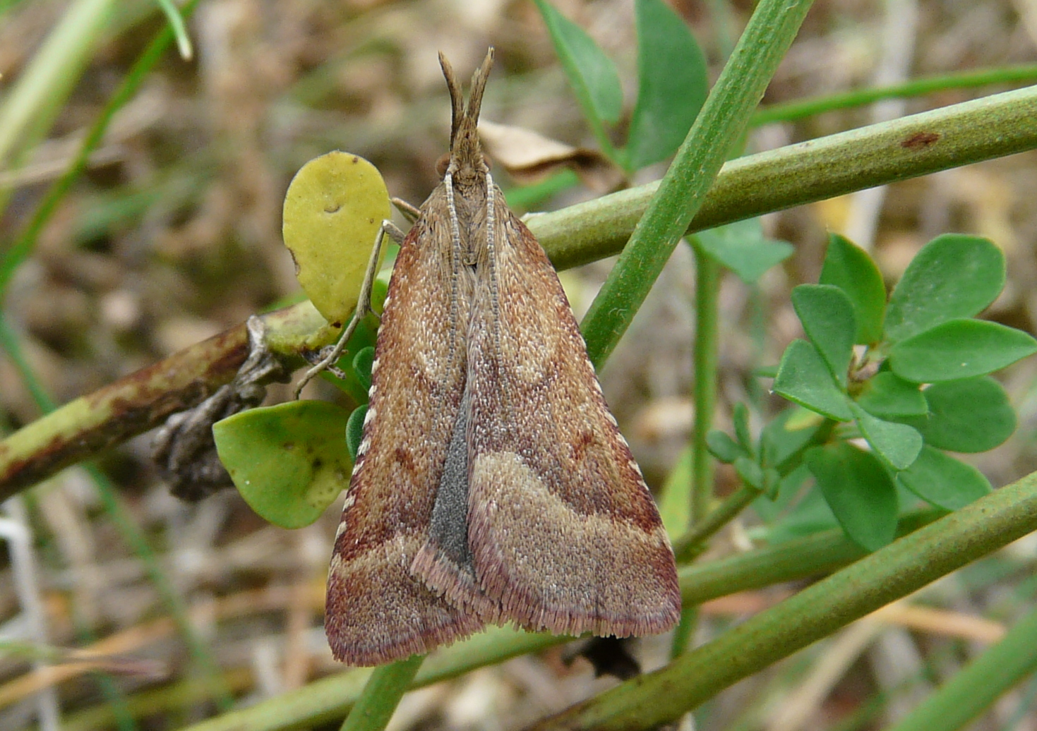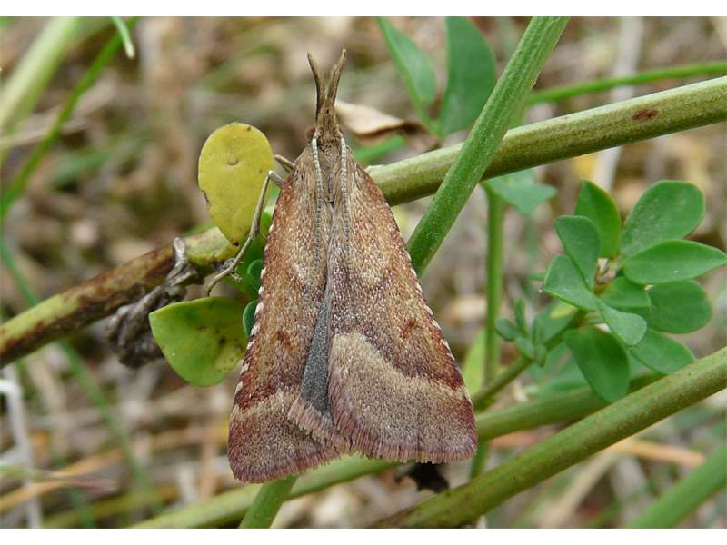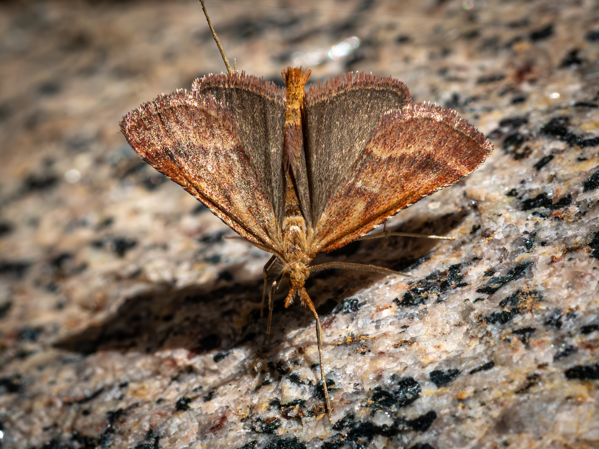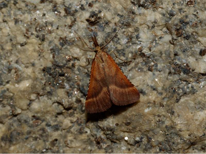 Vorderflügel rotbraun (Männchen) bzw. hellgelbbraun (Weibchen); Flügelform auffällig einem rechtwinkligen Dreieck mit abgerundetem rechten Winkel gleichend; bei etwa 1/3 und 3/4 jeweils eine gebogene Querlinie. Querlinien beim Männchen hellbraun, die zum Mittelfeld hin dunkelbraun gesäumt sind; beim Weibchen Querlinien braun. Mitteelfeld dunkler als die übrige Flügelfläche; mittig mit undeutlichem dunklen Punkt. Dünner, dunkelbrauner Costalstreifen, der von kleinen weißen Schrägstrichen unterbrochen ist.