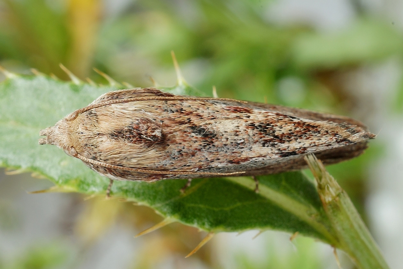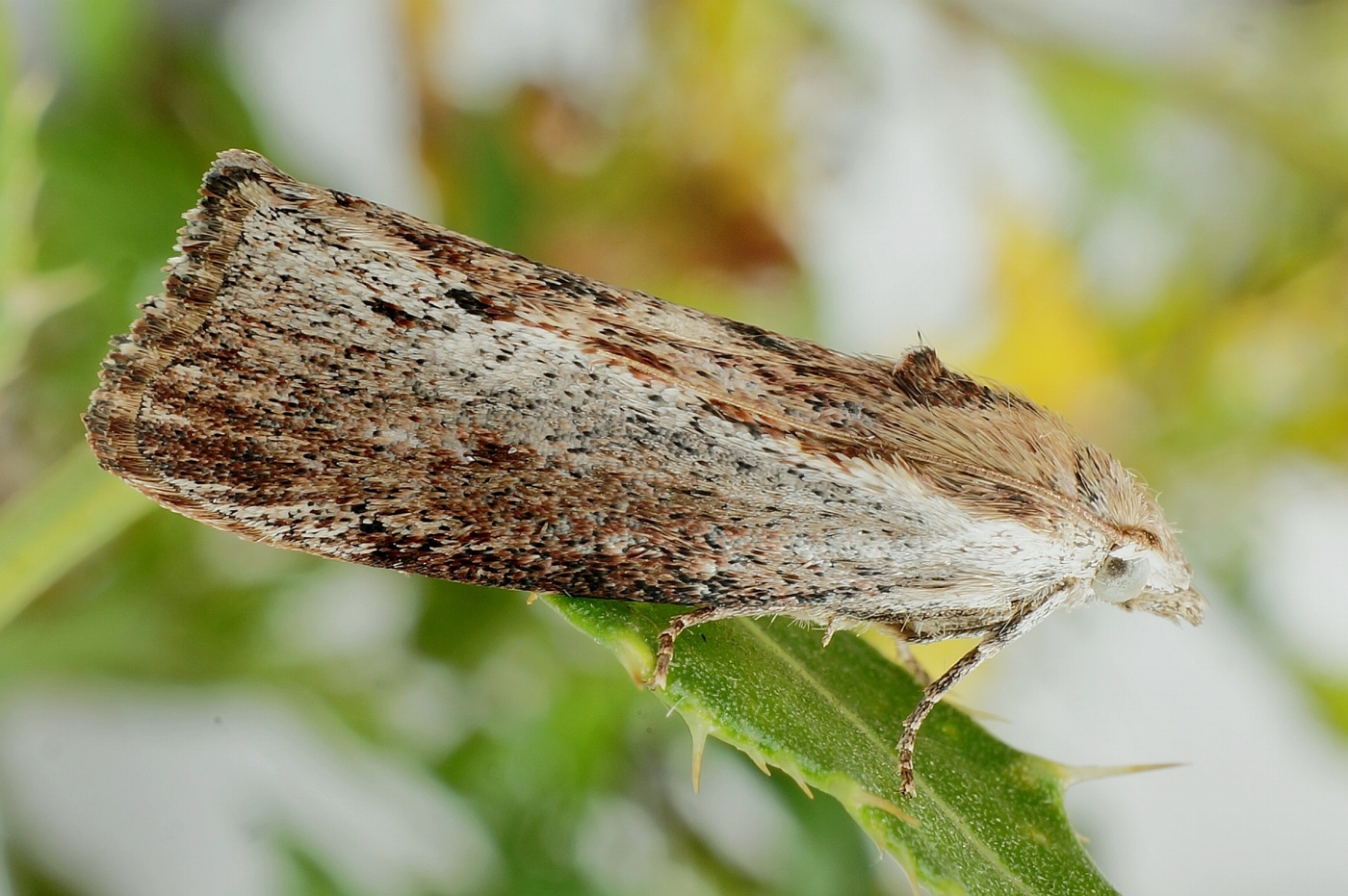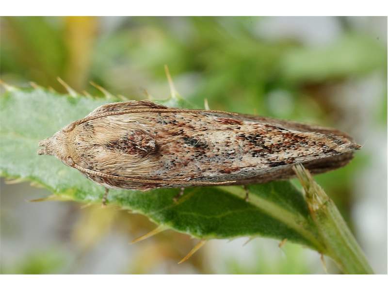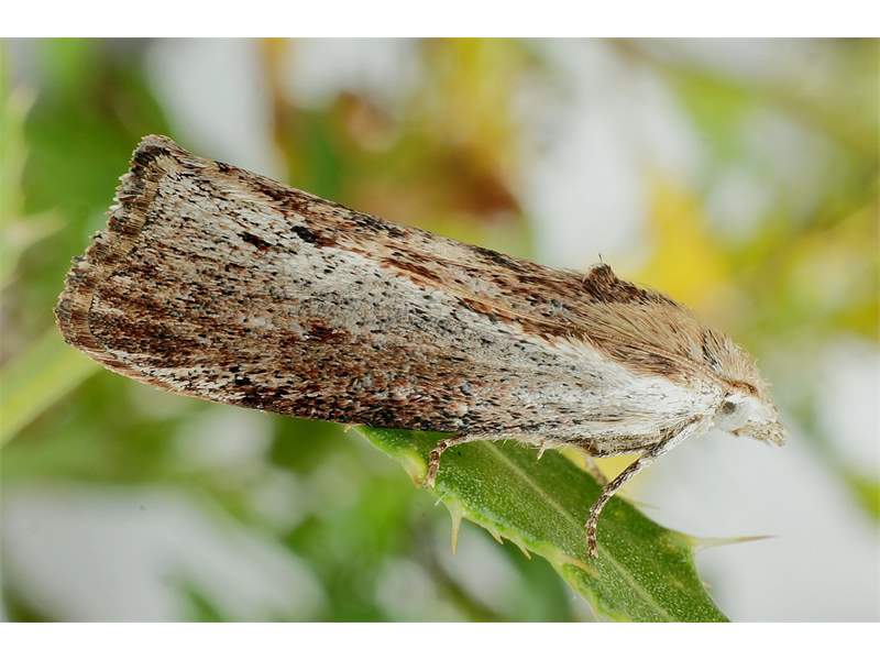 Vorderflügel X–Y mm; Außenrand deutlich konkav eingebuchtet; bei 2/3 eine undeutliche, gebogene Querlinie aus kurzen lückig angeordneten, schwarzen Längsstrichen; Hinterrand von der Mitte der Flügelbasis bis zum Flügelinnenwinkel hellbraun mit dunkelbraunen und schwarzen Flecken; übrige Flügelfläche hellgrau, zur Flügelspitze hin mit Farbübergang zu braun und dunkelbraun beschuppten Flügeladern.