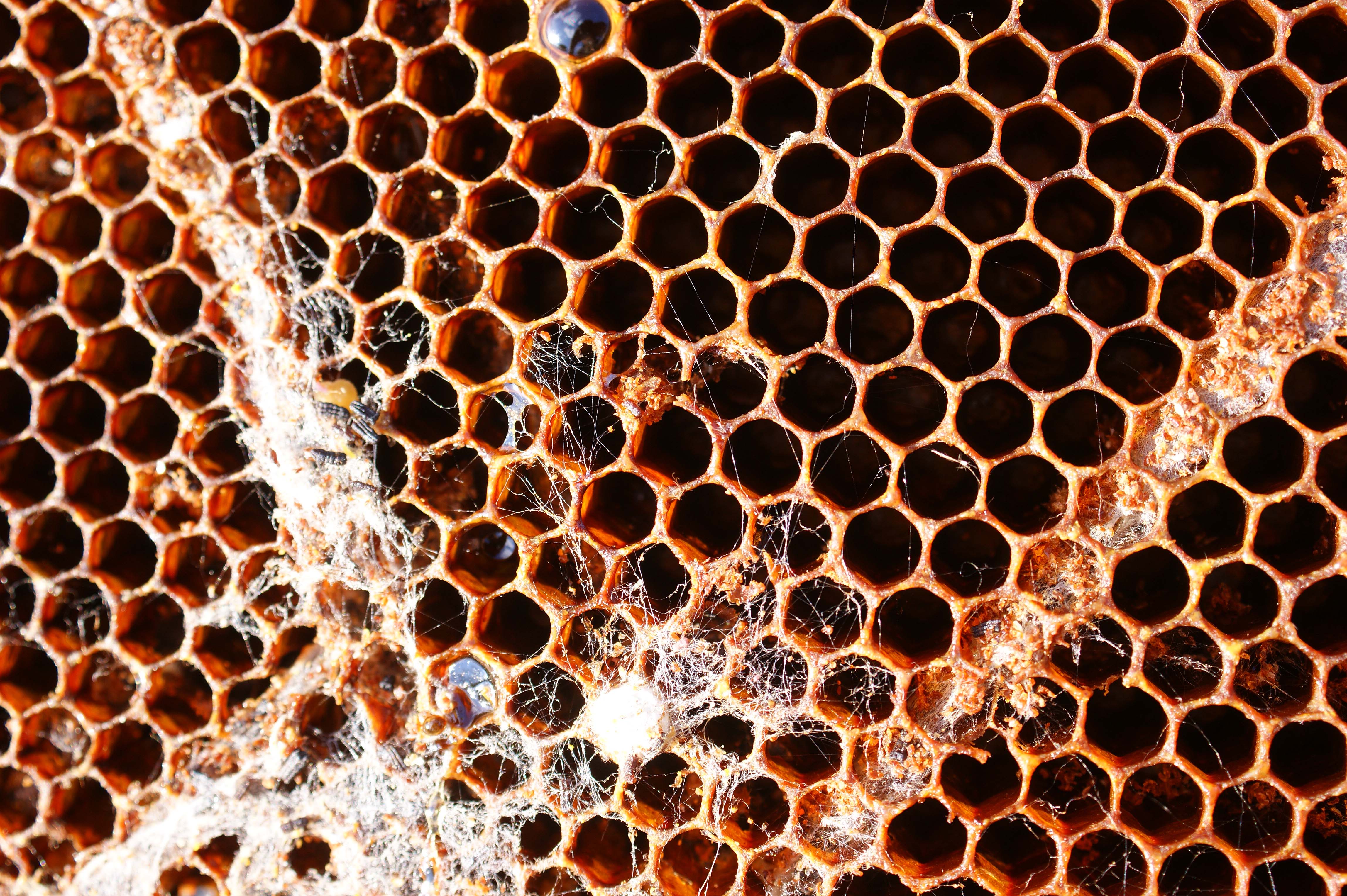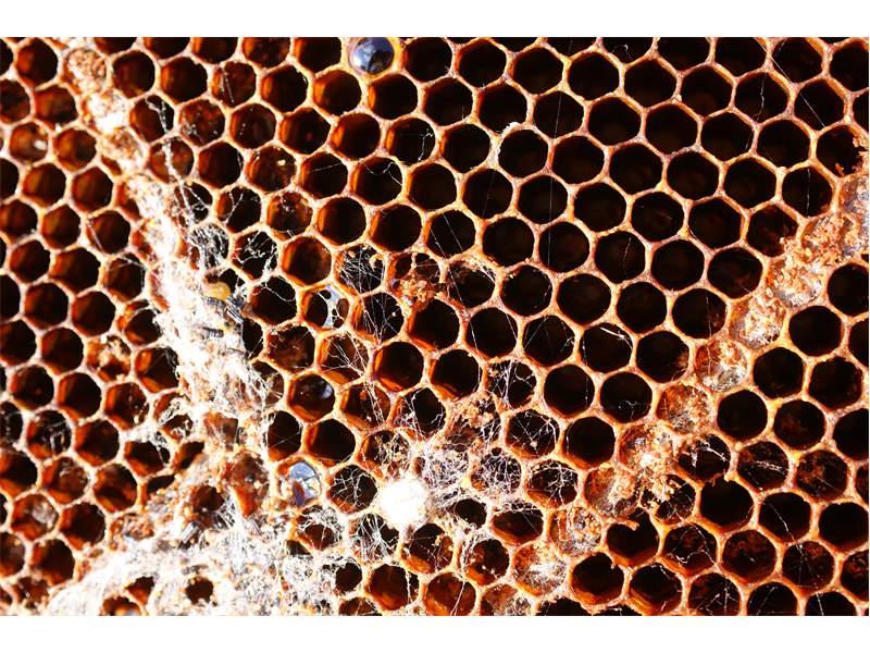 Larvengang der Wachsmotte mit Gespinstfäden auf Bienenwabe, Garten in Hoyerswerda, 11.06.2015