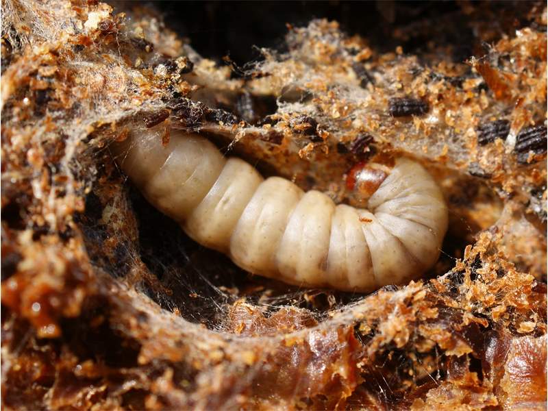 Larve der Wachsmotte auf Bienenwabe, Garten in Hoyerswerda, 11.06.2015