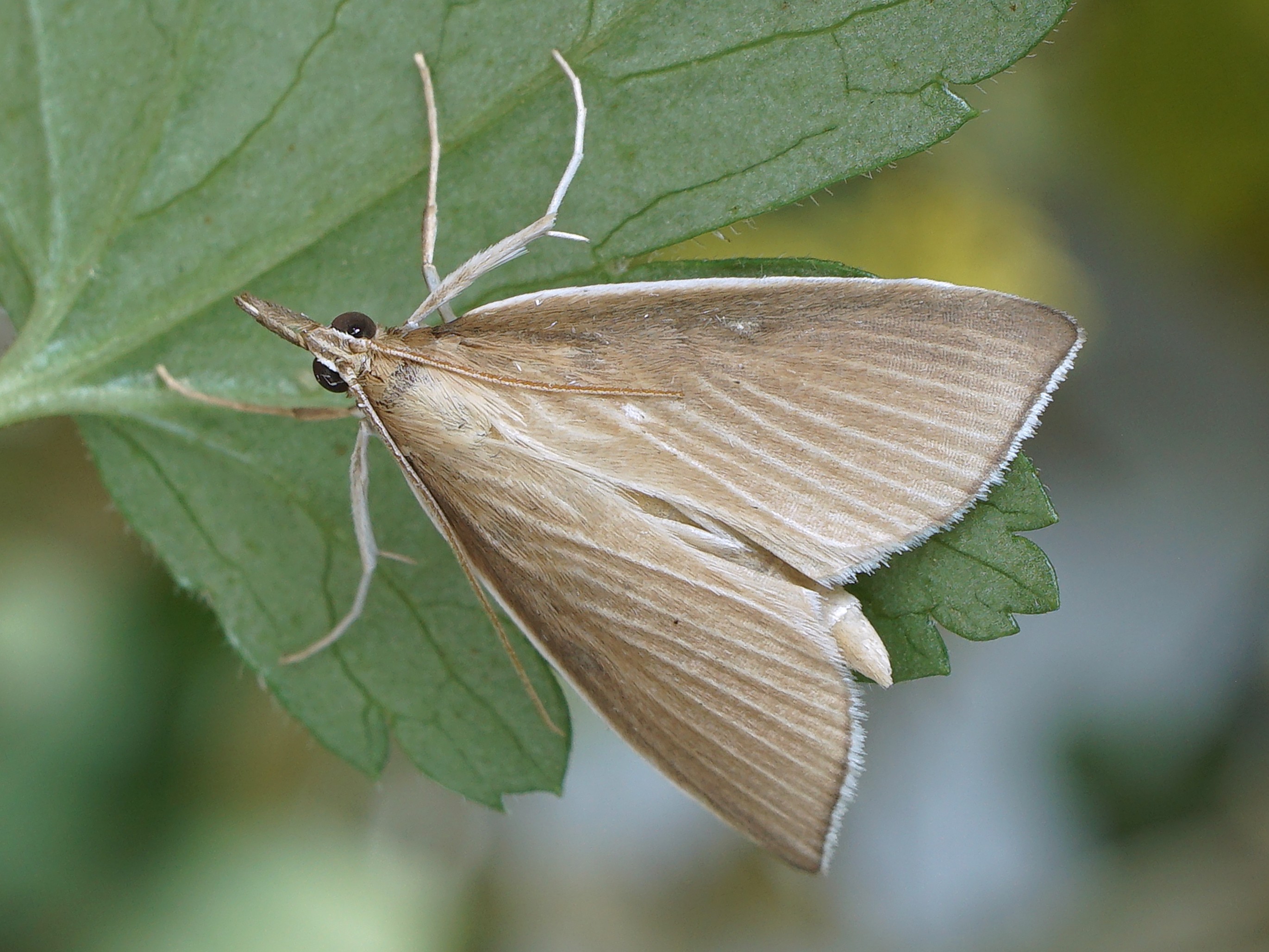 Vorderflügel hellbraun, Vorderand (Costa) schmal weiß gerandet, Makeln unscheinbar als kleine dunkle Depressionen sichtbar, Flügeladern vor allem in der hinteren Flügelhälfte hell oder weiß beschuppt; Apex deutlich spitzwinklig, Flügelaußenrand etwas verdunkelt, Fransensaum weiß.