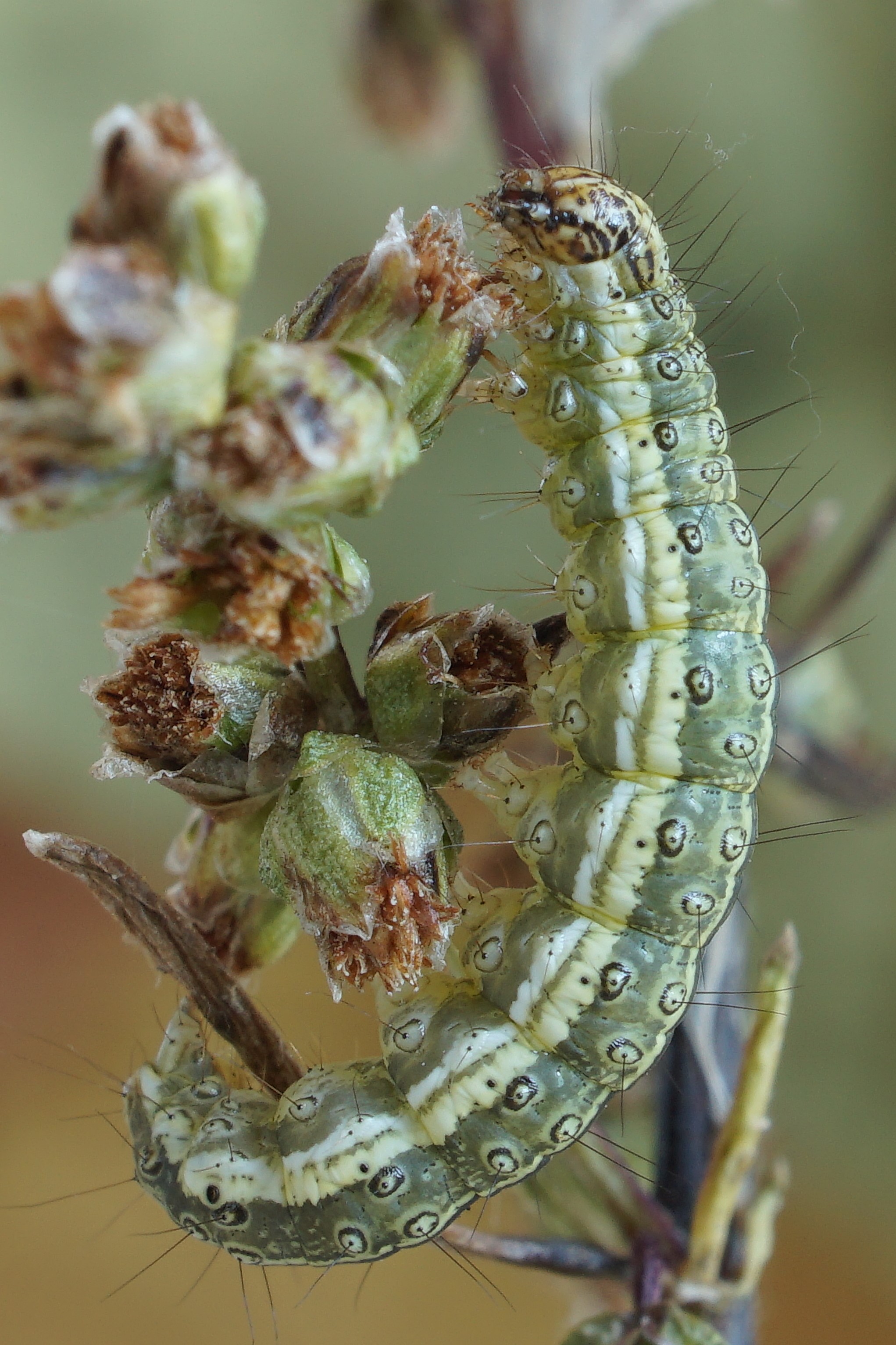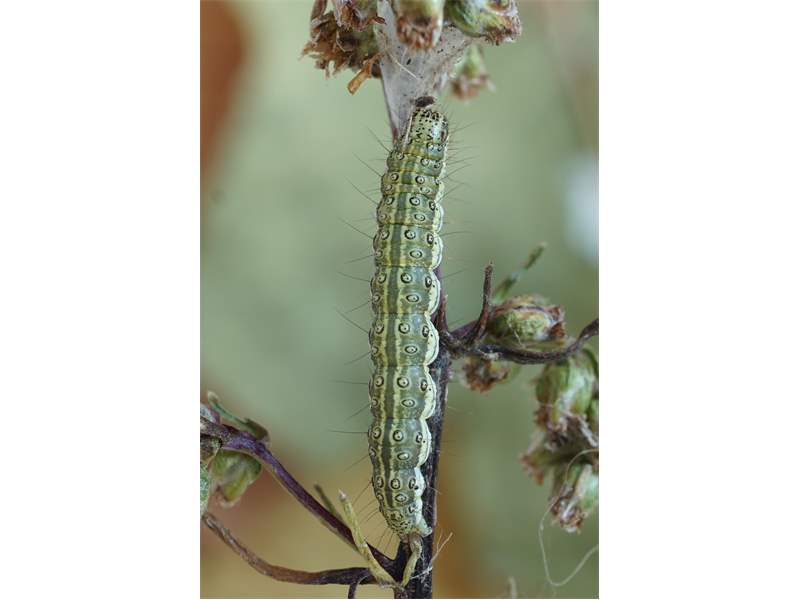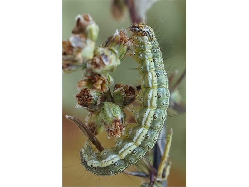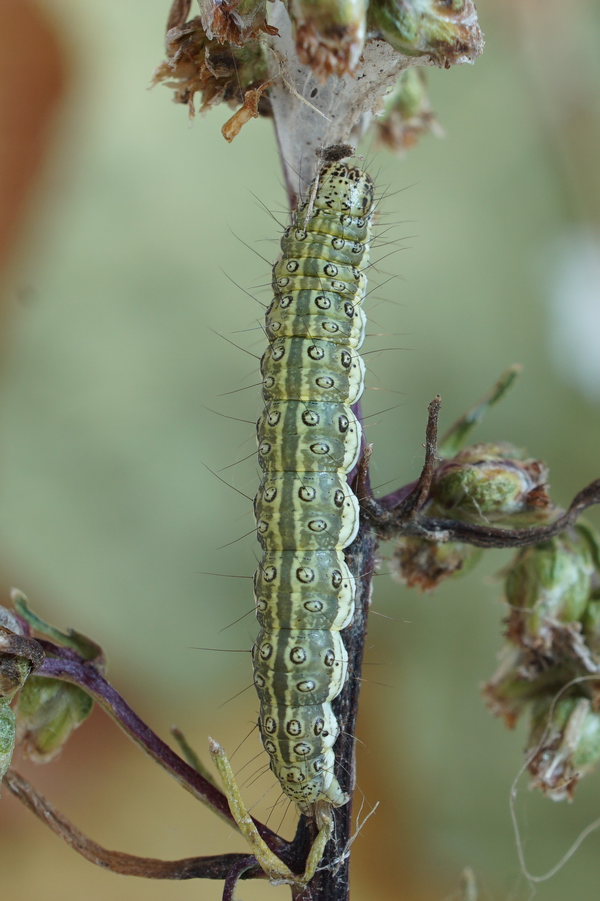 Burg, Anfang Oktober 2021, Raupe an Feldbeifuß. Zum fotografieren aus dem Gespinnst geholt.