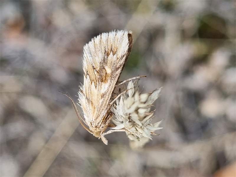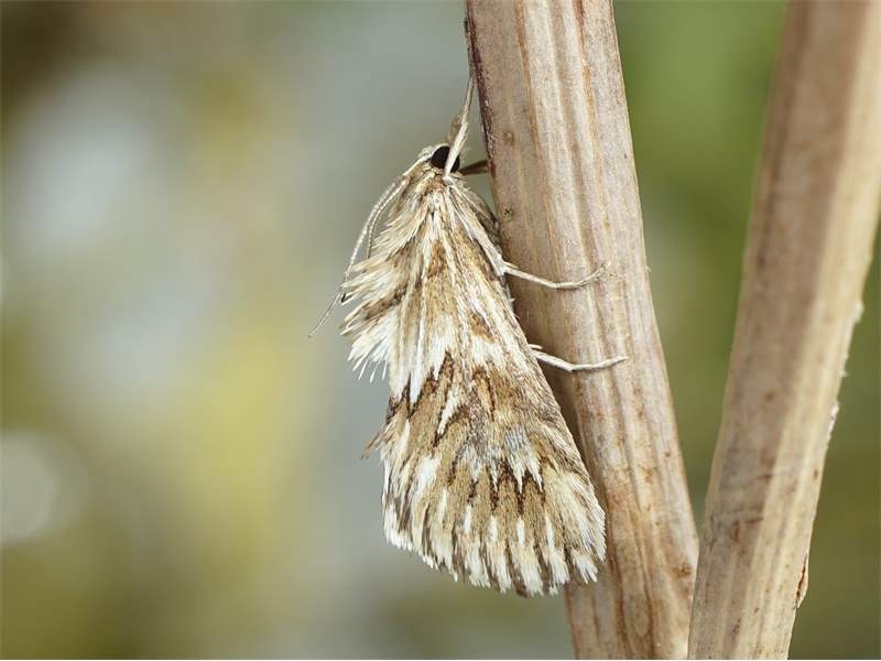 Vorderflügel X–Y mm lang; braun; bei 3/4 eine stark gezähnte dunkelbraune Querlinie, die auf der Flügelmitte eine Biegung macht und bei 1/2 auf dem Flügelhinterrand endet; Basalfeld hellbraun, entlang der gezackten Querlinie weiß oder cremefarben; an der Biegung der Querlinie braune gezackte Zeichnungselemente; Außenfeld braun, am Apex mit einem weißen Dreieck und weißen Linien, die sich von den Zacken der Querlinie zum Flügelaußenrand ziehen; Marginalflecken dunkelbraun und strichförmig; Fransensaum weiß, dunkelbraun auf Höhe jedes Marginalflecks.