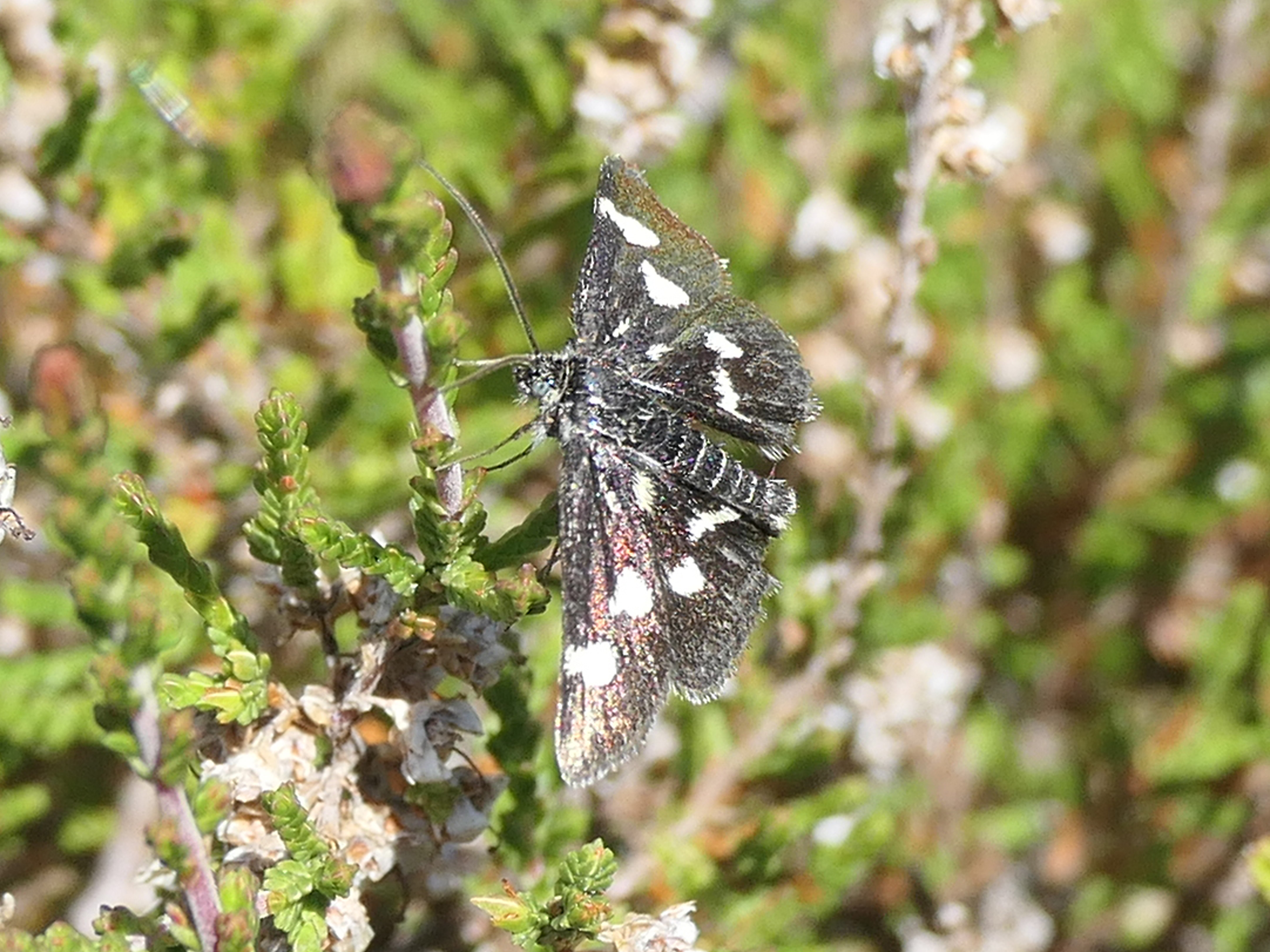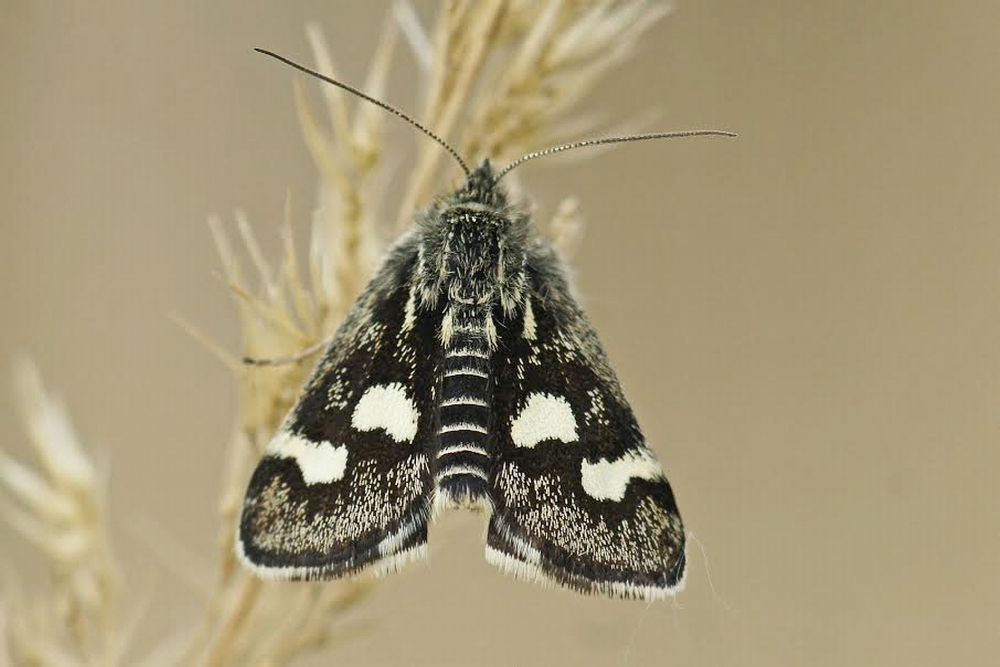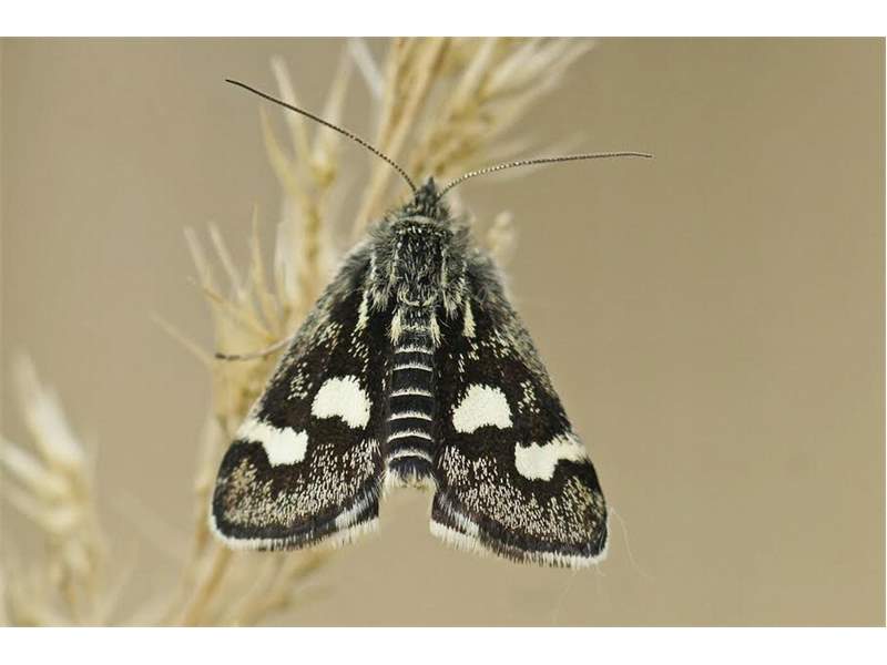 Ähnliche Arten: Anania funebris, bei der der distale weiße Fleck auf dem Vorderflügel nicht mit dem Flügelvorderrand in Kontakt steht und deren Tegulae gelb gefärbt sind.