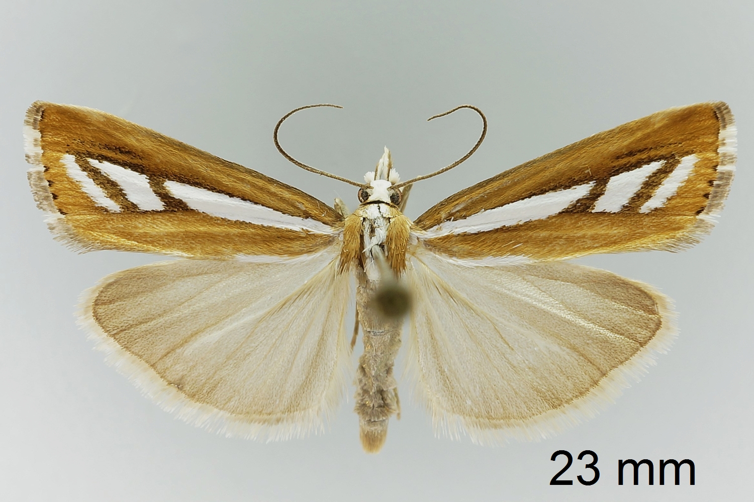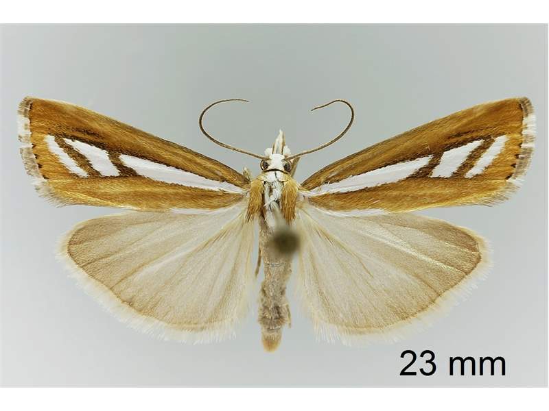 Vorderflügel X–Y mm lang; braun; breiter weißer längsverlaufender Medianstreifen von der Basis bis etwa 9/10, der sich zum Flügelaußenrand hin verbreitert; Medianstreifen bei 3/5 und 7/8 von je einer breiten dunkelbraunen, schräg verlaufenden Linie unterbrochen; Marginalflecken schwarz; Fransensaum graubraun mit kontrastreichen weißen Bereichen auf Höhe des Medianstreifens.