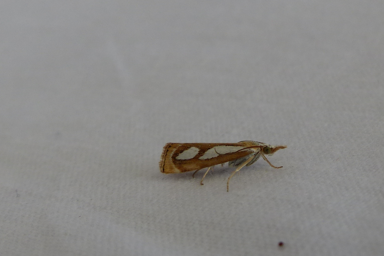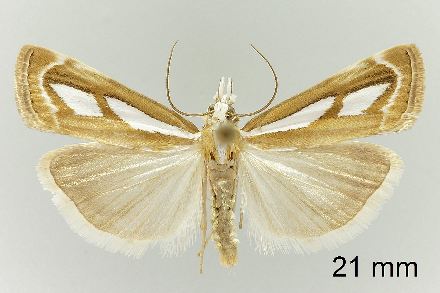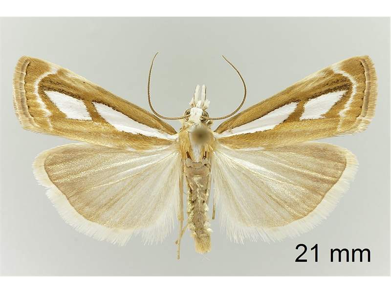 Vorderflügel X–Y mm lang; hell rotbraun oder gelbbraun; breiter weißer längsverlaufender Medianstreifen von der Basis bis etwa 9/10, der sich distal verbreitert; Medianstreifen bei 3/5 von einer breiten dunkelbraunen schräg verlaufenden Linie unterbrochen und in der distalen Hälfte schwarzbraun umsäumt; bei 9/10 ist der Medianstreifen zu einer schmalen weißen Querlinie verbreitert, die vom Flügelhinterrand bis -vorderrand reicht; Marginalflecken schwarz; Fransensaum braun.