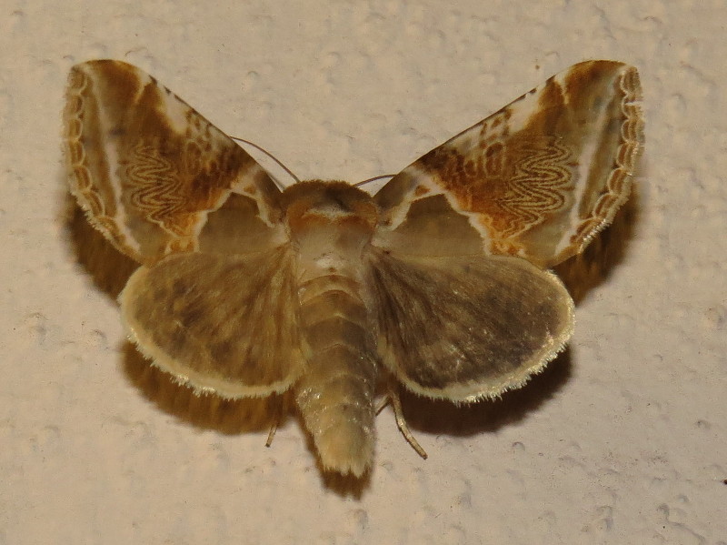 Vorderflügeloberseite: Eine Mischung aus grau. weiß, orange und rötlichen Farbtönen. Erkennbar sind in der Flügelmitte zwei dunkle, hell gerandete Makeln, die größere von beiden ist hell gekernt. Zum Außenrand folgt dann eine stark geschwungene helle Querlinie, die weder den Vorder- noch den Hinterrand erreicht. Von der Flügelspitze zum Hinterand verläuft eine gerade weißliche Linie. Saumwärts davon ist eine, mit dem Flügelaußenrand meist sieben Halbmonde einschließende, helle Bogenlinie deutlich ausgeprägt.