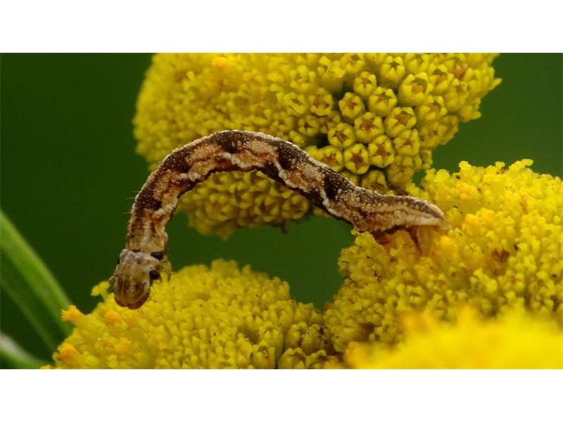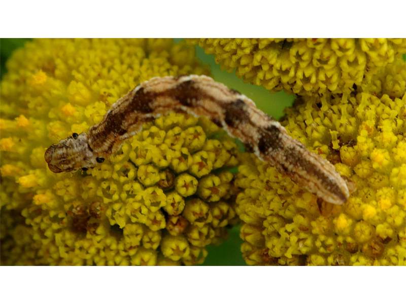 Larve von Eupithecia virgaureata in der Gemarkung Hohenprießnitz, Kahns Berg, an Rainfarn (Tanacetum vulgare), September 2014 (© Michael Happ)( Bild vergrößern)