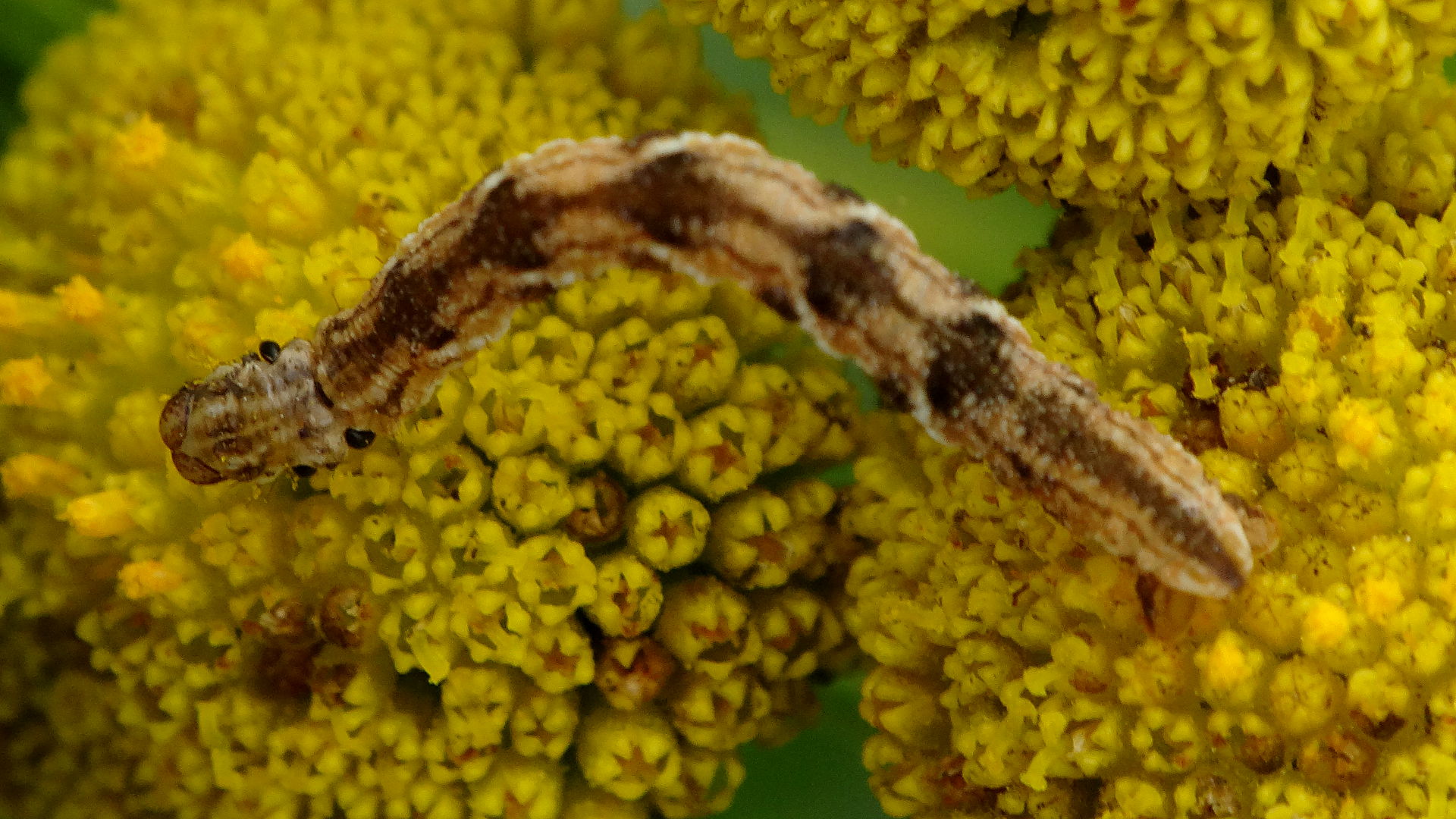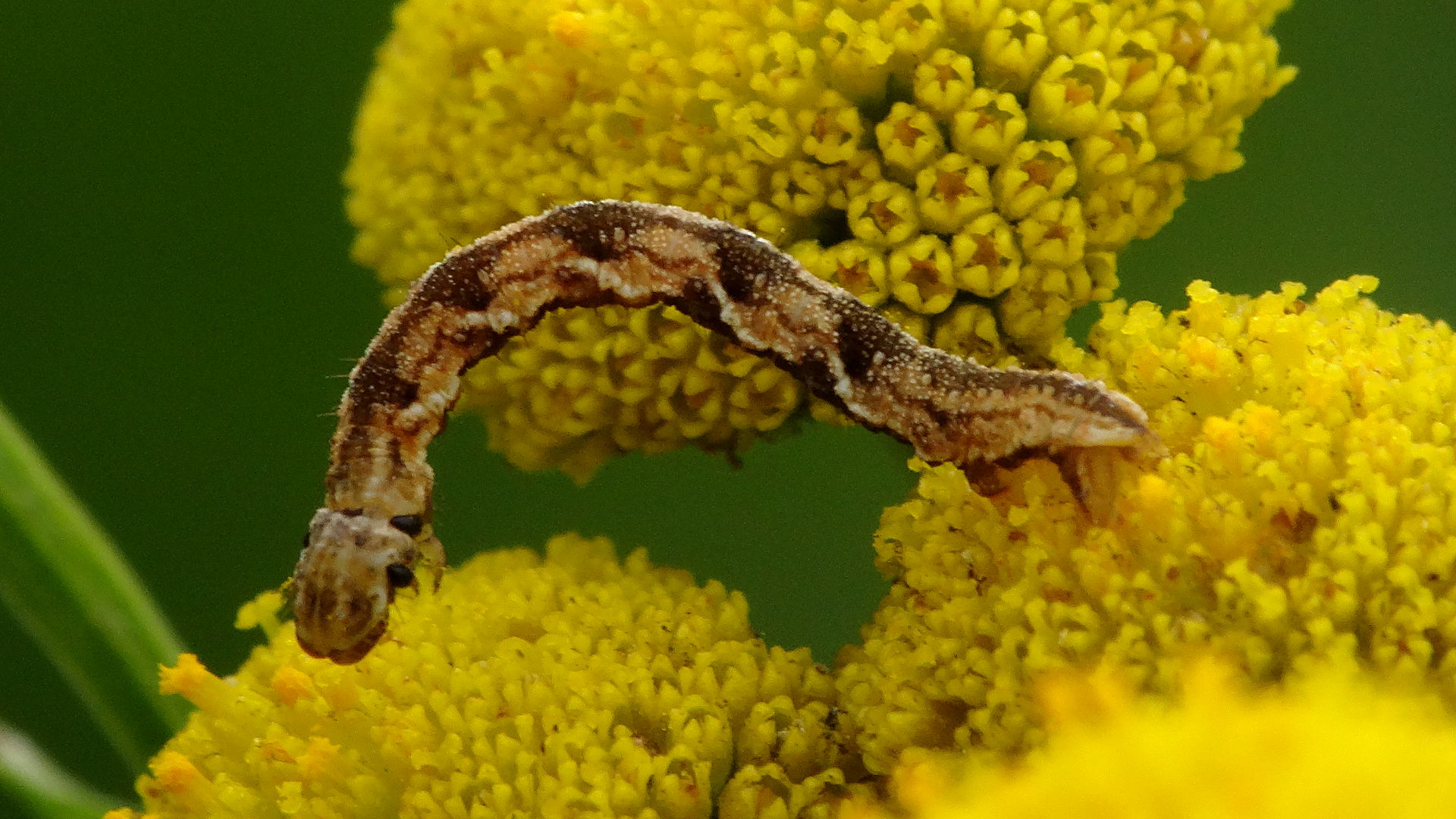 Larve von Eupithecia virgaureata in der Gemarkung Hohenprießnitz, Kahns Berg, an Rainfarn (Tanacetum vulgare), September 2014