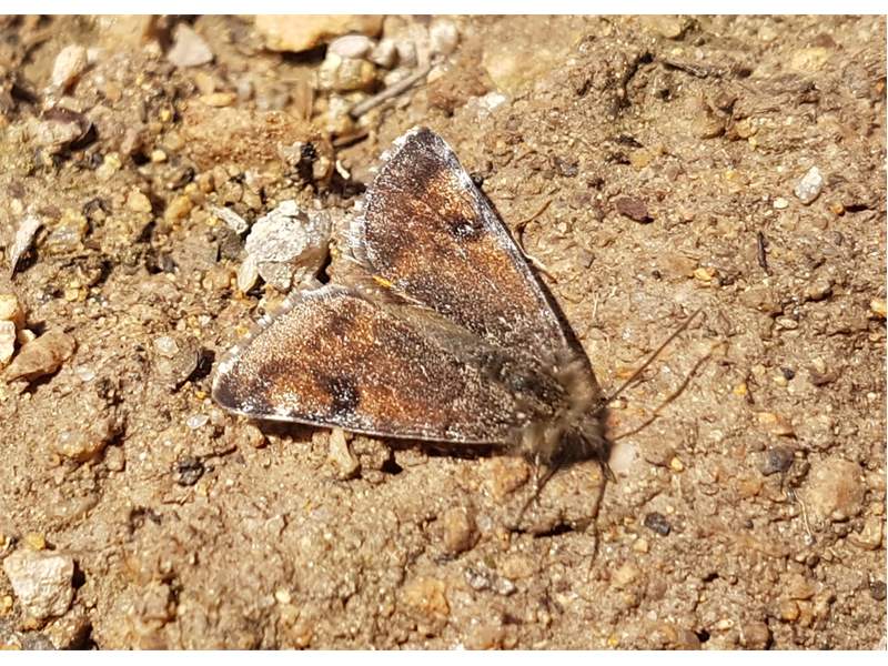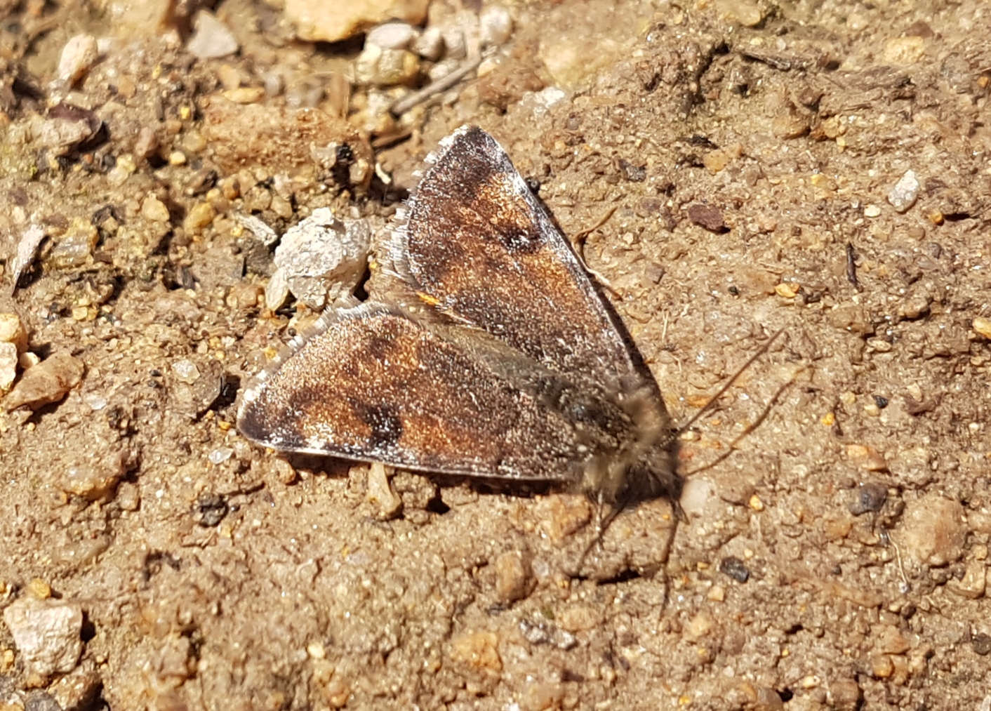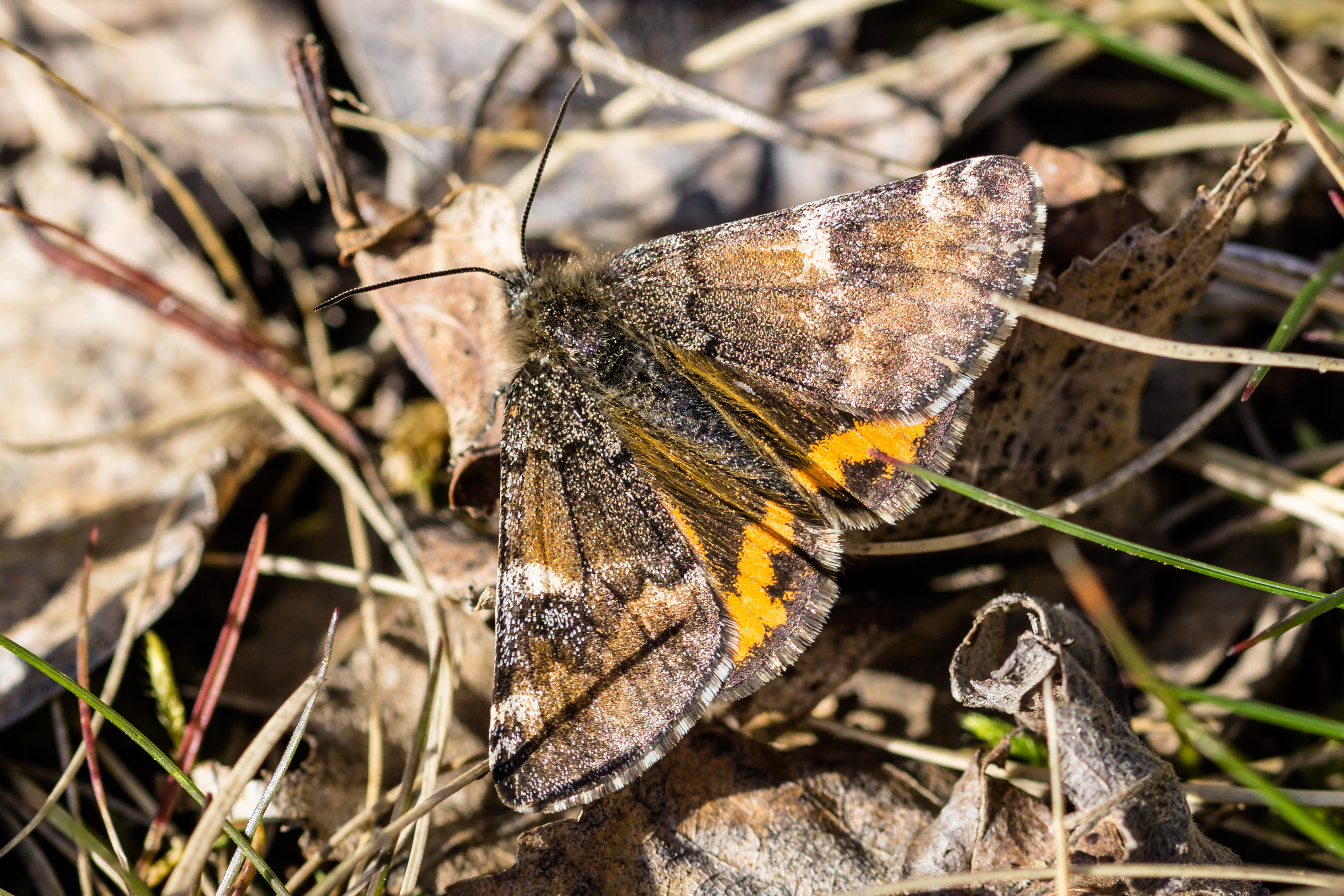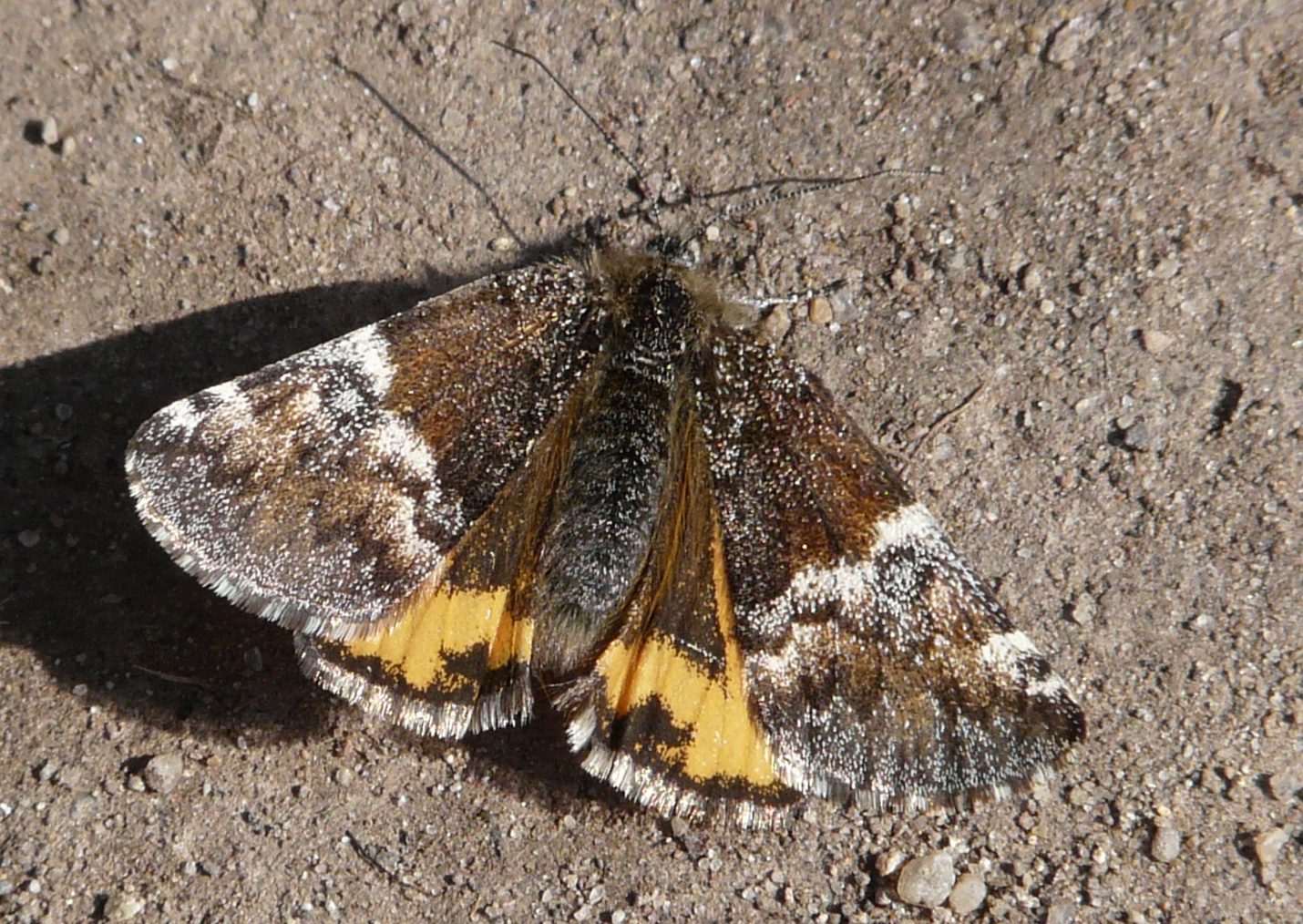 Vorderflügel braun, schwarze Querlinien und Zellmakel deutlich oder kaum vorhanden, einige Individuen mit grauer Durchmischung; meist mit drei weißen Flecken am Vorderrand; äußere Querlinie deutlich gezackt. Hinterflügel orange, mit dunkelbraunem Rand und großem schwarzen Zellfleck. Fransen schwarz-weiß gescheckt.